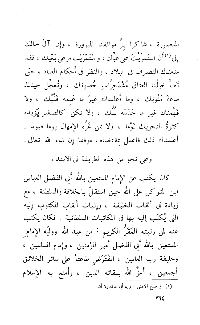كَانَ يكْتب عَن الإِمَام المستعين بِاللَّه أبي الْفضل الْعَبَّاس بن المتَوَكل على الله حِين اسْتَقل بالخلافة والسلطنة مَعَ زِيَادَة فِي ألقاب الْخَلِيفَة وَإِثْبَات ألقاب الْمَكْتُوب إِلَيْهِ الَّتِي يكْتب إِلَيْهِ بهَا فِي المكاتبات السُّلْطَانِيَّة فَكَانَ يكْتب عَنهُ لمن رتبته الْمقر الْكَرِيم من عبد الله ووليه الإِمَام المستعين بِاللَّه أبي الْفضل أَمِير الْمُؤمنِينَ وَإِمَام الْمُسلمين وَخَلِيفَة رب الْعَالمين المفترض طَاعَته على سَائِر الْخَلَائق أَجْمَعِينَ أعز الله بِبَقَائِهِ الدّين وأمتع بِهِ الْإِسْلَام