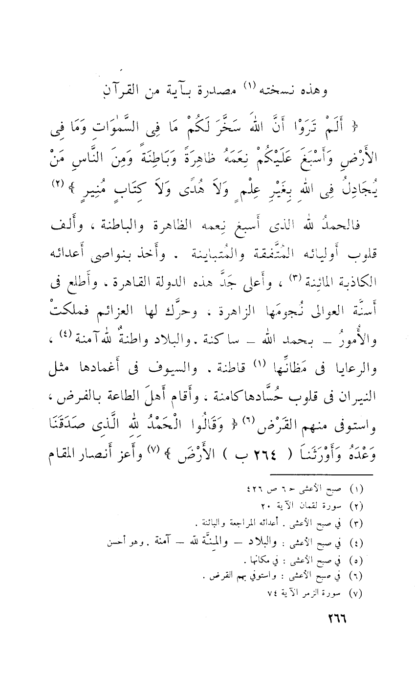 فَالْحَمْد لله الَّذِي أَسْبغ نعمه الظَّاهِرَة والباطنة وَألف قُلُوب أوليائه المتفقة والمتباينة وَأخذ بنواصي أعدائه الكاذبة المائنة وَأَعْلَى جد هَذِه الدولة الْقَاهِرَة وأطلع فِي أسنة العوالي نجومها الزاهرة وحرك لَهَا العزائم فملكت والأمور بِحَمْد الله سَاكِنة والبلاد واطنة لله آمِنَة والرعايا فِي مظانها قاطنة وَالسُّيُوف فِي أغمادها مثل النيرَان فِي قُلُوب حسادها كامنة وَأقَام أهل الطَّاعَة بِالْفَرْضِ وَاسْتوْفى مِنْهُم الْقَرْض {وَقَالُوا الْحَمد لله الَّذِي صدقنا وعده وأورثنا الأَرْض} وأعز أنصار الْمقَام