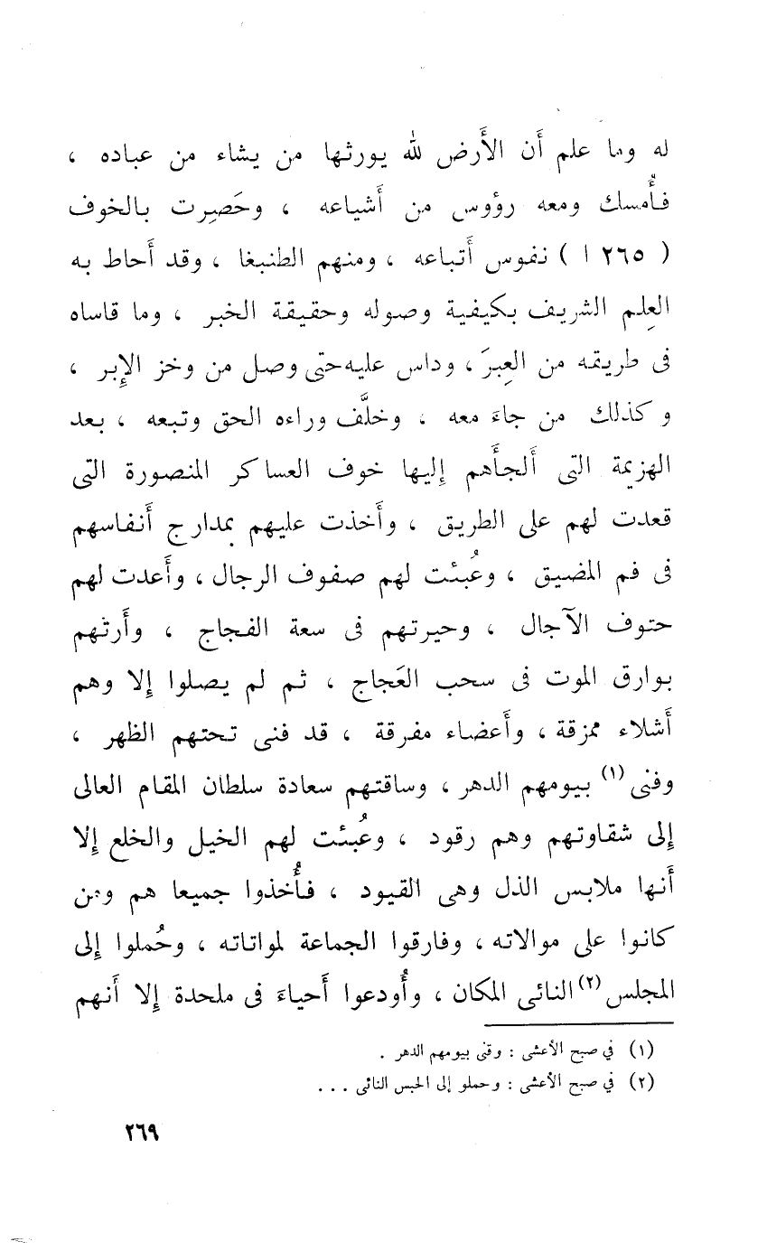 لَهُ وَمَا علم أَن الأَرْض لله يُورثهَا من يَشَاء من عباده فَأمْسك وَمَعَهُ رُؤُوس من أشياعه وحصرت بالخوف نفوس أَتْبَاعه وَمِنْهُم الطنبغا وَقد أحَاط بِهِ الْعلم الشريف بكيفية وُصُوله وَحَقِيقَة الْخَبَر وَمَا قاساه فِي طَرِيقه من العبر وداس عَلَيْهِ حَتَّى وصل من وخز الإبر وَكَذَلِكَ من جَاءَ مَعَه وَخلف وَرَاءه الْحق وَتَبعهُ بعد الْهَزِيمَة الَّتِي ألجأهم إِلَيْهَا خوف العساكر المنصورة الَّتِي قعدت لَهُم على الطَّرِيق وَأخذت عَلَيْهِم بمدارج أنفاسهم فِي فَم الْمضيق وعبئت لَهُم صُفُوف الرِّجَال وأعدت لَهُم حتوف الْآجَال وحيرتهم فِي سَعَة الفجاج وأرتهم بوارق الْمَوْت فِي سحب العجاج ثمَّ لم يصلوا إِلَّا وهم أشلاء ممزقة وأعضاء مفرقة قد فنى تَحْتهم الظّهْر وفنى بيومهم الدَّهْر وساقتهم سَعَادَة سُلْطَان الْمقَام العالي إِلَى شقاوتهم وهم رقود وعبئت لَهُم الْخَيل وَالْخلْع إِلَّا أَنَّهَا ملابس الذل وَهِي الْقُيُود فَأخذُوا جَمِيعًا هم وَمن كَانُوا على موالاته وفارقوا الْجَمَاعَة لمواتاته وحملوا إِلَى الْمجْلس النائي الْمَكَان وأودعوا أَحيَاء فِي ملحدة إِلَّا أَنهم