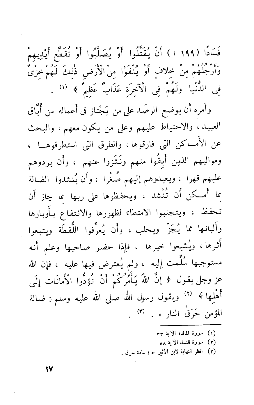 وَأمره أَن يوضع الرصد على من يجتاز فِي أَعماله من أباق العبيد وَالِاحْتِيَاط عَلَيْهِم وعَلى من يكون مَعَهم والبحث عَن الْأَمَاكِن الَّتِي فارقوها والطرق الَّتِي استطرقوها ومواليهم الَّذين أَبقوا مِنْهُم ونشزوا عَنْهُم وَأَن يردوهم عَلَيْهِم قهرا ويعيدوهم إِلَيْهِم صغرا وَأَن ينشدوا الضَّالة بِمَا أمكن أَن تنشد ويحفظوها على رَبهَا بِمَا جَازَ أَن تحفظ ويتجنبوا الامتطاء لظوهرها وَالِانْتِفَاع بأوبارها وَأَلْبَانهَا مِمَّا يجز ويحلب وَأَن يعرفوا اللّقطَة ويتبعوا أَثَرهَا ويشيعوا خَبَرهَا فَإِذا حضر صَاحبهَا وَعلم أَنه مستوجبها سلمت إِلَيْهِ وَلم يعتر فِيهَا عَلَيْهِ فَإِن الله عز وَجل يَقُول {إِن الله يَأْمُركُمْ أَن تُؤَدُّوا الْأَمَانَات إِلَى أَهلهَا} وَيَقُول رَسُول الله صلى الله عَلَيْهِ وَسلم ضَالَّة الْمُؤمن حرق النَّار