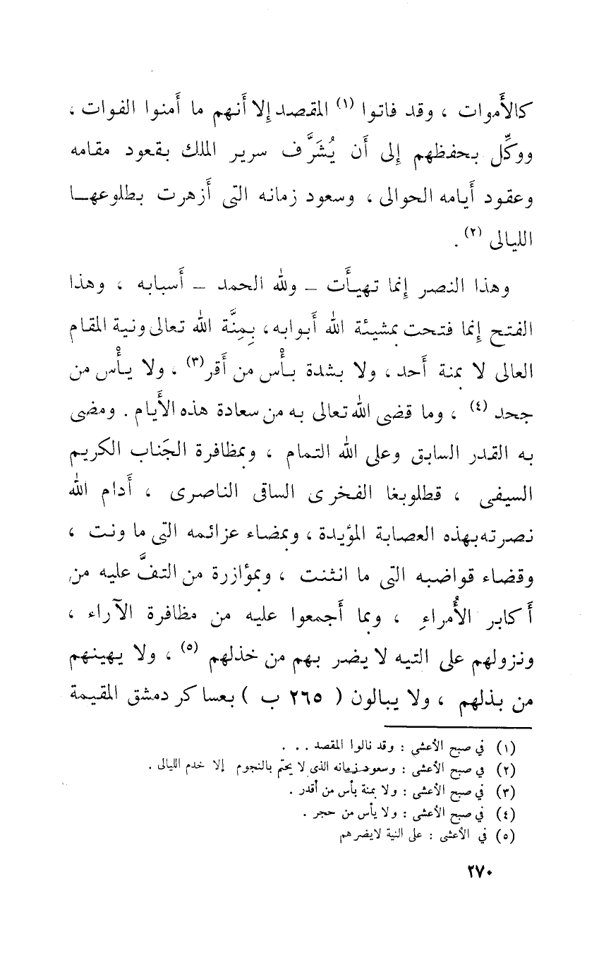 وَهَذَا النَّصْر إِنَّمَا تهيأت وَللَّه الْحَمد أَسبَابه وَهَذَا الْفَتْح إِنَّمَا فتحت بِمَشِيئَة الله أبوابه بمنة الله تَعَالَى وَنِيَّة الْمقَام العالي لَا بمنة أحد وَلَا بِشدَّة بَأْس من أقرّ وَلَا يأس من جحد وَمَا قضى الله تَعَالَى بِهِ من سَعَادَة هَذِه الْأَيَّام وَمضى بِهِ الْقدر السَّابِق وعَلى الله التَّمام وبمظافرة الجناب الْكَرِيم السيفي قطلوبغا الفخري الساقي الناصري أدام الله نصرته بِهَذِهِ الْعِصَابَة المؤيدة وبمضاء عَزَائِمه الَّتِي مَا ونت وَقَضَاء قواضبه الَّتِي مَا انْثَنَتْ وبمؤازرة من التف عَلَيْهِ من أكَابِر الْأُمَرَاء وَبِمَا أَجمعُوا عَلَيْهِ من مظافرة الآراء ونزولهم على التيه لَا يضر بهم من خذلهم وَلَا يهينهم من بذلهم وَلَا يبالون بعساكر دمشق المقيمة