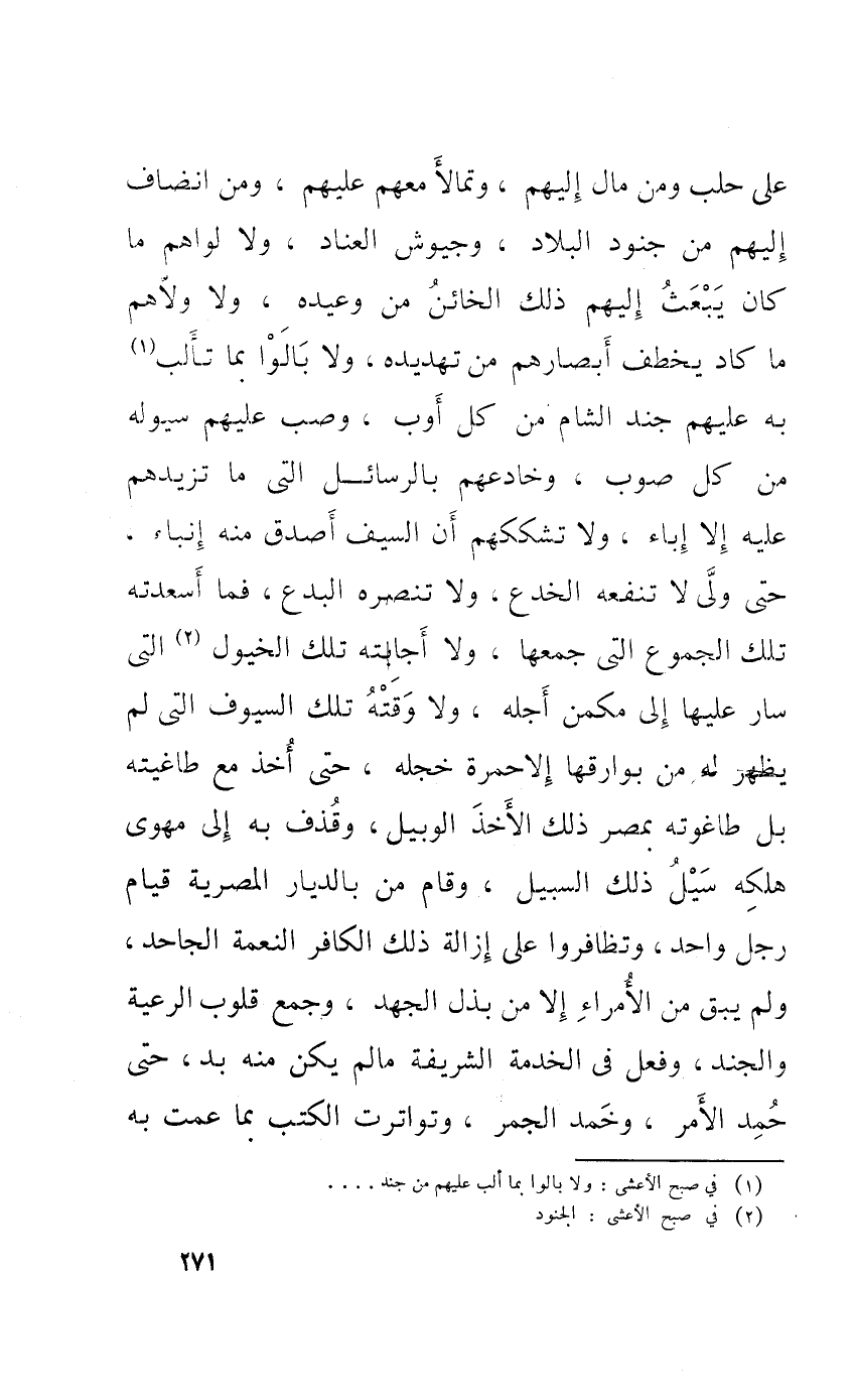 على حلب وَمن مَال إِلَيْهِم وتمالأ مَعَهم عَلَيْهِم وَمن انضاف إِلَيْهِم من جنود الْبِلَاد وجيوش العناد وَلَا لواهم مَا كَانَ يبْعَث إِلَيْهِم ذَلِك الخائن من وعيده وَلَا ولاهم مَا كَاد يخطف أَبْصَارهم من تهديده وَلَا بالوا بِمَا تالب بِهِ عَلَيْهِم جند الشَّام من كل أَوب وصب عَلَيْهِم سيوله من كل صوب وخادعهم بالرسائل الَّتِي مَا تزيدهم عَلَيْهِ إِلَّا إباء وَلَا تشككهم أَن السَّيْف أصدق مِنْهُ إنباء حى ولى لَا تَنْفَعهُ الخدع وَلَا تنصره الْبدع فَمَا أسعدته تِلْكَ الجموع الَّتِي جمعهَا وَلَا أَجَابَتْهُ تِلْكَ الْخُيُول الَّتِي سَار عيها إِلَى مكمن أَجله وَلَا وقته تِلْكَ السيوف الَّتِي لم يظْهر لَهُ بوارقها إِلَّا حمرَة خجلة حَتَّى أَخذ مَعَ طاغيته بل طاغوته بِمصْر ذَلِك الْأَخْذ الوبيل وَقذف بِهِ إِلَى مهوى هلكه سيل ذَلِك السَّبِيل وَقَامَ من بالديار المصرية قيام رجل وَاحِد وتظافروا على إِزَالَة ذَلِك الْكَافِر النِّعْمَة الجاحد وَلم يبْق من الْأُمَرَاء إِلَّا من بذل الْجهد وَجمع قُلُوب الرّعية والجند وَفعل فِي الْخدمَة الشَّرِيفَة مالم يكن مِنْهُ بُد حَتَّى حمد الْأَمر وخمد الْجَمْر وتواترت الْكتب بِمَا عَمت بِهِ