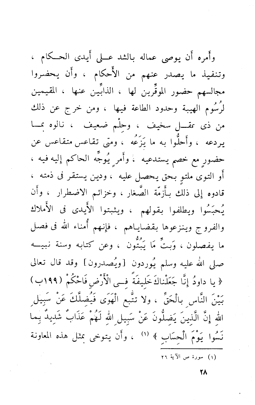 وَأمره أَن يُوصي عماله بالشد على أَيدي الْحُكَّام وتنفيذ مَا يصدر عَنْهُم من الْأَحْكَام وَأَن يحضروا مجَالِسهمْ حُضُور الموقرين لَهَا الذابين عَنْهَا المقيمين لرسوم الهيبة وحدود الطَّاعَة فِيهَا وَمن خرج عَن ذَلِك من ذِي عقل سخيف وحلم ضَعِيف نالوه بِمَا يردعه وَأَحلُّوا بِهِ مَا يزعه وَمَتى تقاعس متقاعس عَن حُضُور مَعَ خصم يستدعيه وَأمر يُوَجه الْحَاكِم إِلَيْهِ فِيهِ أَو التوى ملتو بِحَق يحصل عَلَيْهِ وَدين يسْتَقرّ فِي ذمَّته قادوه إِلَى ذَلِك بأزمة الصغار وخزائم الِاضْطِرَار وَأَن يحبسوا ويطلقوا بقَوْلهمْ ويثبتوا الْأَيْدِي فِي الْأَمْلَاك والفروج وينزعوها بقضاياهم فَإِنَّهُم أُمَنَاء الله فِي فصل مَا يفصلون وَبت مَا يبتون وَعَن كِتَابه وَسنة نبيه صلى الله عَلَيْهِ وَسلم يوردون وَيَصْدُرُونَ وَقد قَالَ تَعَالَى {يَا دَاوُد إِنَّا جعلناك خَليفَة فِي الأَرْض فاحكم بَين النَّاس بِالْحَقِّ وَلَا تتبع الْهوى فيضلك عَن سَبِيل الله إِن الَّذين يضلون عَن سَبِيل الله لَهُم عَذَاب شَدِيد بِمَا نسوا يَوْم الْحساب} وَأَن يتوخى بِمثل هَذِه المعاونة