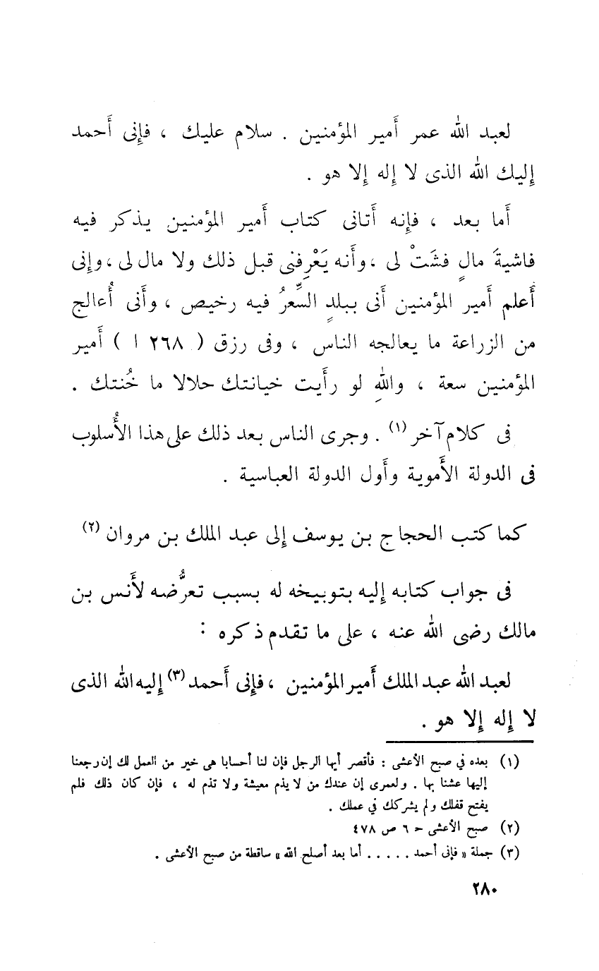 لعبد الله عمر أَمِير الْمُؤمنِينَ سَلام عَلَيْك فَإِنِّي أَحْمد إِلَيْك الله الَّذِي لَا إِلَه إِلَّا هُوَ