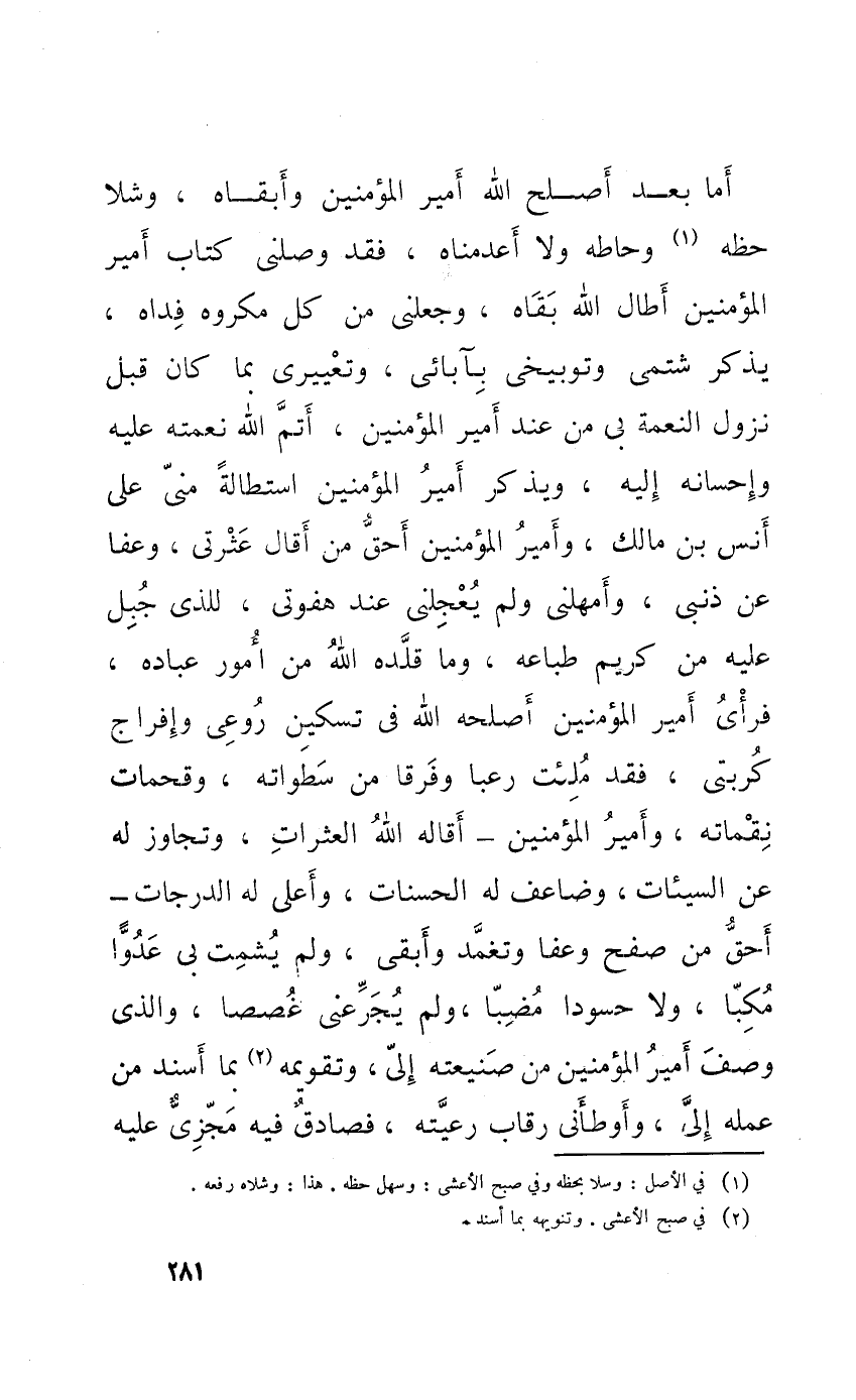 أما بعد أصلح الله أَمِير الْمُؤمنِينَ وأبقاه وشلا حَظه وحاطه وَلَا أعدمناه فقد وصلني كتاب أَمِير الْمُؤمنِينَ أَطَالَ الله بقاه وَجَعَلَنِي من كل مَكْرُوه فدَاه يذكر شتمي وتوبيخي بآبائي وتعييري بِمَا كَانَ قبل نزُول النِّعْمَة بِي من عِنْد أَمِير الْمُؤمنِينَ أتم الله نعْمَته عَلَيْهِ وإحسانه إِلَيْهِ وَيذكر أَمِير الْمُؤمنِينَ استطالة مني على أنس بن مَالك وأمير الْمُؤمنِينَ أَحَق من أقَال عثرتي وَعَفا عَن ذَنبي وأمهلني وَلم يعجلني عِنْد هفوتي للَّذي جبل عَلَيْهِ من كريم طباعه وَمَا قَلّدهُ الله من أُمُور عباده فَرَأى أَمِير الْمُؤمنِينَ أصلحه الله فِي تسكين روعي وإفراج كربتي فقد ملئت رعْبًا وفرقا من سطواته وقحمات نقماته وأمير الْمُؤمنِينَ أقاله الله العثرات وَتجَاوز لَهُ عَن السَّيِّئَات وضاعف لَهُ الْحَسَنَات وَأَعْلَى لَهُ الدَّرَجَات أَحَق من صفح وَعَفا وتغمد وَأبقى وَلم يشمت بِي عدوا مكبا وَلَا حسودا مضبا وَلم يجرعني عصصا وَالَّذِي وصف أَمِير الْمُؤمنِينَ من صنيعته إِلَيّ وتقويمه بِمَا أسْند من عمله إِلَيّ وأوطأني رِقَاب رَعيته فصادق فِيهِ مَجْزِي عَلَيْهِ