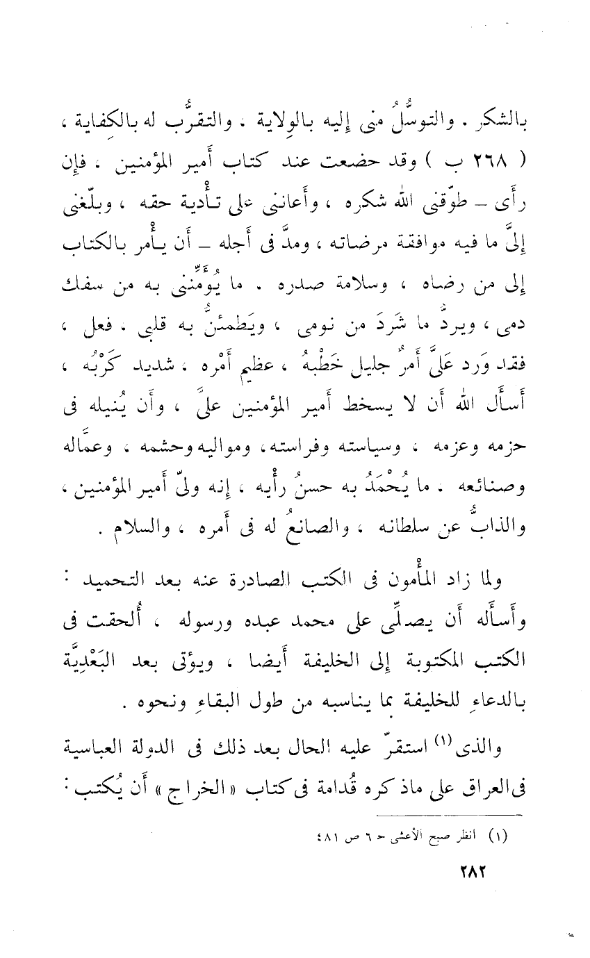 بالشكر والتوسل منى إِلَيْهِ بِالْولَايَةِ والتقرب لَهُ بالكفاية وَقد خضعت عِنْد كتاب أَمِير الْمُؤمنِينَ فَإِن رأى طوقنى الله شكره وأعانني على تأدية حَقه وَبَلغنِي إِلَى مَا فِيهِ مُوَافقَة مرضاته وَمد فِي أَجله أَن يَأْمر بِالْكتاب إِلَى من رِضَاهُ وسلامة صَدره مَا يؤمنني بِهِ من سفك دمي وَيرد مَا شرد من نومي ويطمئن بِهِ قلبِي فعل فقد ورد عَليّ أَمر جليل خطبه عَظِيم أمره شَدِيد كربه أسأَل الله أَن لَا يسْخط أَمِير الْمُؤمنِينَ عَليّ وَأَن ينيله فِي حزمه وعزمه وسياسته وفراسته ومواليه وحشمه وعماله وصنعائه مَا يحمد بِهِ حسن رَأْيه إِنَّه ولي أَمِير الْمُؤمنِينَ والذاب عَن سُلْطَانه والصانع لَهُ فِي أمره وَالسَّلَام