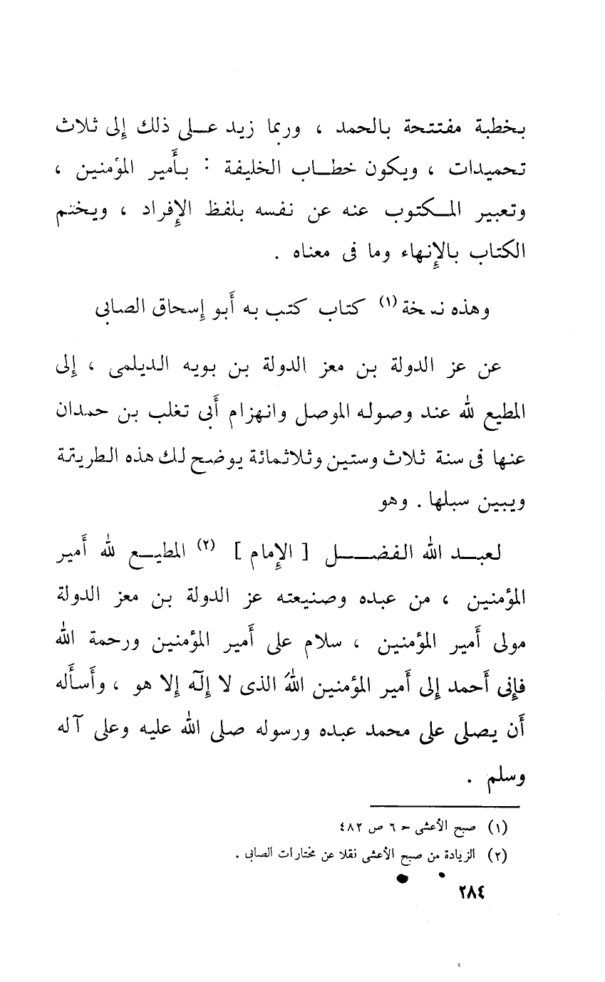 لعبد الله الْفضل الإِمَام الْمُطِيع لله أَمِير الْمُؤمنِينَ من عَبده وصنيعته عز الدولة بن معز الدولة مولى أَمِير الْمُؤمنِينَ سَلام على أَمِير الْمُؤمنِينَ وَرَحْمَة الله فَإِنِّي أَحْمد إِلَى أَمِير الْمُؤمنِينَ الله الَّذِي لَا إِلَه إِلَّا هُوَ وأسأله أَن يُصَلِّي على مُحَمَّد عَبده وَرَسُوله صلى الله عَلَيْهِ وعَلى آله وَسلم