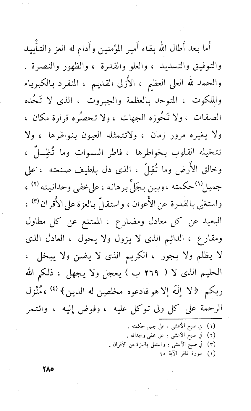 أما بعد أَطَالَ الله بَقَاء أَمِير الْمُؤمنِينَ وأدام لَهُ الْعِزّ والتأييد والتوفيق والتسديد والعلو وَالْقُدْرَة والظهور والنصرة وَالْحَمْد لله الْعلي الْعَظِيم الأزلي الْقَدِيم الْمُنْفَرد بالكبرياء والملكوت المتوحد بالعظمة والجبروت الَّذِي لَا تحده الصِّفَات وَلَا تحوزه الْجِهَات وَلَا تحصره قرارة مَكَان وَلَا يُغَيِّرهُ مُرُور زمَان وَلَا تتمثله الْعُيُون بنواظرها وَلَا تتخيله الْقُلُوب بخواطرها فاطر السَّمَوَات وَمَا تظل وخالق الأَرْض وَمَا تقل الَّذِي دلّ بلطيف صَنعته على جميل حكمته وَبَين بجلي برهانه على خَفِي وحدانيته وَاسْتغْنى بِالْقُدْرَةِ على الأعوان واستقلى بِالْعِزَّةِ على الأقران الْبعيد عَن كل معادل ومضارع الْمُمْتَنع عَن كل مطاول ومقارع الدَّائِم الَّذِي لَا يَزُول وَلَا يحول الْعَادِل الَّذِي لَا يظلم وَلَا يجور الْكَرِيم الَّذِي لَا يضن وَلَا يبخل الْحَلِيم الَّذِي لَا يعجل وَلَا يجهل ذَلِكُم الله ربكُم {لَا إِلَه إِلَّا هُوَ فَادعوهُ مُخلصين لَهُ الدّين} منزل الرَّحْمَة على كل ولي توكل عَلَيْهِ وفوض إِلَيْهِ وائتمر
