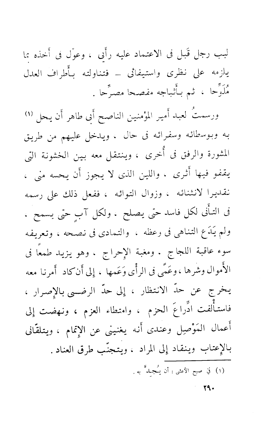 ورسمت لعبد أَمِير الْمُؤمنِينَ الناصح أبي طَاهِر أَن يحل بِهِ وبوسطائه وسفرائه فِي حَال وَيدخل عَلَيْهِم من طَرِيق المشورة والرفق فِي أُخْرَى وينتقل مَعَه بَين الخشونة الَّتِي يقفو فِيهَا أثري واللين الَّذِي لَا يجوز أَن يحسه مني تَقْديرا لانثنائه وَزَوَال التوائه فَفعل ذَلِك على رسمه فِي التأني لكل فَاسد حَتَّى يصلح وَلكُل آب حَتَّى يسمح وَلم يدع التناهي فِي وعظه والتمادي فِي نصحه وتعريفه سوء عَاقِبَة اللجاج ومغبة الإحراج وَهُوَ يزِيد طَمَعا فِي الْأَمْوَال وشرها وعمى فِي الرَّأْي وعمها إِلَى أَن كَاد أمرنَا مَعَه يخرج عَن حد الِانْتِظَار إِلَى حد الرضى بالإصرار فاستألفت ادراع الحزم وامتطاء الْعَزْم ونهضت إِلَى أَعمال الْموصل وَعِنْدِي أَنه يغنيني عَن الْإِتْمَام ويتلقاني بالإعتاب وينقاد إِلَى المُرَاد ويتجنب طرق العناد