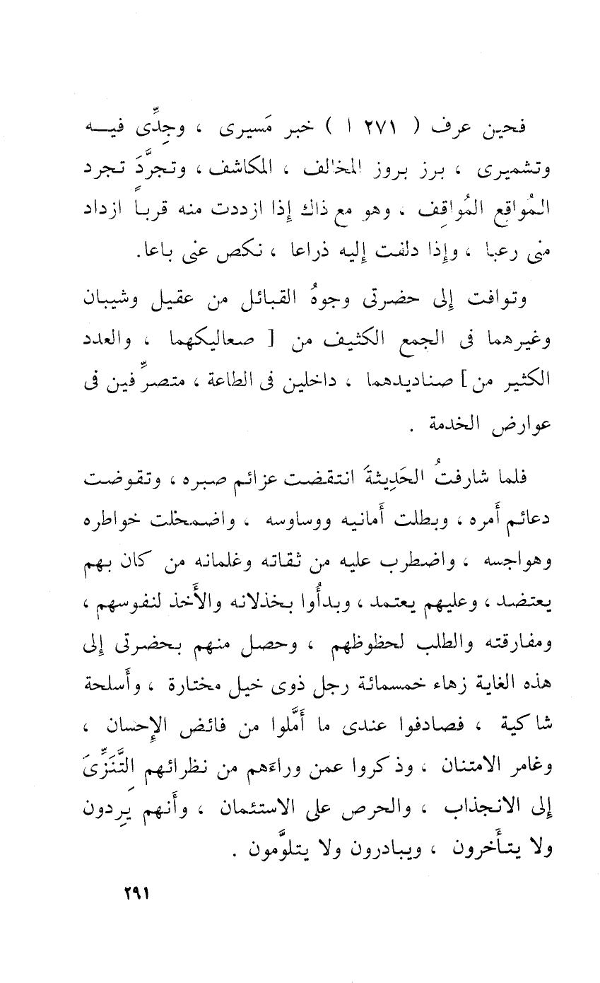 فَلَمَّا شارفت الحديثة انتقضت عزائم صبره وتقوضت دعائم أمره وَبَطلَت أمانيه ووساوسه واضمحلت خواطره وهواجسه واضطرب عَلَيْهِ من ثقاته وغلمانه من كَانَ بهم يعتضد وَعَلَيْهِم يعْتَمد وبدأوا بخذلانه وَالْأَخْذ لنفوسهم ومفارقته والطلب لحظوظهم وَحصل مِنْهُم بحضرتي إِلَى هَذِه الْغَايَة زهاء خَمْسمِائَة رجل ذَوي خيل مختارة وأسلحة شاكية فصادفوا عِنْدِي مَا أملوا من فائض الْإِحْسَان وغامر الإمتنان وَذكروا عَمَّن وَرَاءَهُمْ من نظرائهم التنزي إِلَى الانجذاب والحرص على الاستئمان وَأَنَّهُمْ يردون وَلَا يتأخرون ويبادرون وَلَا يتلومون