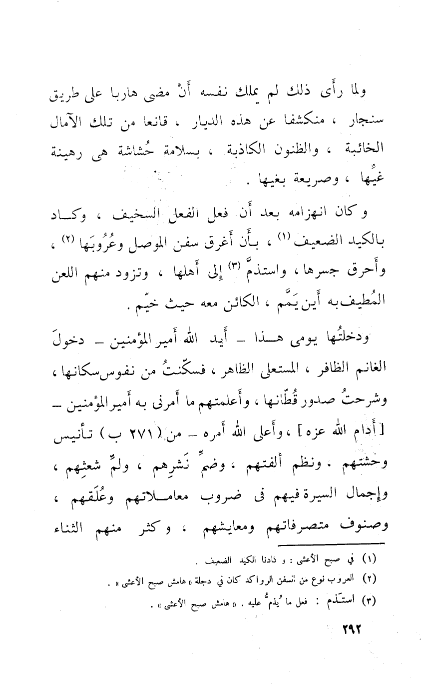 وَلما رأى ذَلِك لم يملك نَفسه أَن مضى هَارِبا على طَرِيق سنجار منكشفا عَن هَذِه الديار قانعا من تِلْكَ الآمال الخائبة والظنون الكاذبة بسلامة حشاشة هِيَ رهينة غيها وصريعة بغيها