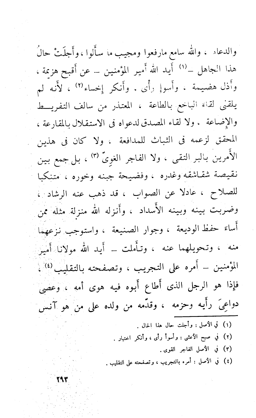 وَالدُّعَاء وَالله سامع مَا رفعوا ومجيب مَا سَأَلُوا وأجلت حَال هَذَا الْجَاهِل أيد الله أَمِير الْمُؤمنِينَ عَن أقبح هزيمَة وأذل هضيمة وأسواء رَأْي وَأنكر إخساء لِأَنَّهُ لم يلقنى لِقَاء الباخع بِالطَّاعَةِ المعتذر من سالف التَّفْرِيط والإضاعة وَلَا لِقَاء الْمُصدق لدعواه فِي الِاسْتِقْلَال بالمقارعة الْمُحَقق لزعمه فِي الثباث للمدافعة وَلَا كَانَ فِي هذَيْن الْأَمريْنِ بِالْبرِّ التقى وَلَا الْفَاجِر الغوي بل جمع بَين نقيصة شقاشقه وغدره وفضيحة جبنه وخوره متنكبا للصلاح عادلا عَن الصَّوَاب قد ذهب عَنهُ الرشاد وَضربت بَينه بَينه الأسداد وأنزله الله منزلَة مثله مِمَّن أَسَاءَ حفظ الْوَدِيعَة وَجوَار الصنيعة واستوجب نزعهما مِنْهُ وتحويلهما عَنهُ وتأملت أيد الله مَوْلَانَا أَمِير الْمُؤمنِينَ أمره على التجريب وتصفحته بالتقليب فَإِذا هُوَ الرجل الَّذِي أطَاع أَبوهُ فِيهِ هوى أمه وَعصى دواعي رَأْيه وحزمه وَقدمه من وَلَده على من هُوَ آنس