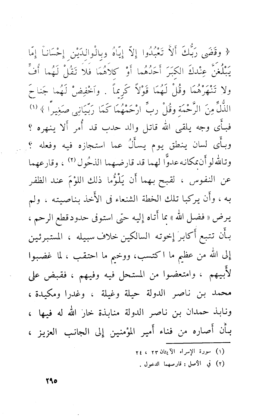 {وَقضى رَبك أَلا تعبدوا إِلَّا إِيَّاه وبالوالدين إحسانا إِمَّا يبلغن عنْدك الْكبر أَحدهمَا أَو كِلَاهُمَا فَلَا تقل لَهما أُفٍّ وَلَا تنهرهما وَقل لَهما قولا كَرِيمًا واخفض لَهما جنَاح الذل من الرَّحْمَة وَقل رب ارحمهما كَمَا ربياني صَغِيرا} فَبِأَي وَجه يلقى الله قَاتل وَالِد حدب قد أَمر أَلا ينهره وَبِأَيِّ لِسَان ينْطق يَوْم يسْأَل عَمَّا استجازه فِيهِ وَفعله وتالله لَو أَن بمكانه عدوا لَهما قد قارضهما الذحول وقارعهما عَن النُّفُوس لقبح بهما أَن يلؤما ذَلِك اللؤم عِنْد الظفر بِهِ وَأَن يركبا تِلْكَ الخطة الشنعاء فِي الْأَخْذ بناصيته وَلم يرض فضل الله بِمَا أَتَاهُ إِلَيْهِ حَتَّى استوفى حُدُود قطع الرَّحِم بِأَن تتبع أكَابِر إخْوَته السالكين خلاف سَبيله المستبرئين إِلَى الله من عَظِيم مَا اكْتسب ووخيم مَا احتقب لما غضبوا لأبيهم وامتعضوا من المستحيل فِيهِ وَفِيهِمْ فَقبض على مُحَمَّد بن نَاصِر الدولة حِيلَة وغيلة وغدرا ومكيدة ونابذ حمدَان بن نَاصِر الدولة منابذة خار الله لَهُ فِيهَا بِأَن أصاره من فنَاء أَمِير الْمُؤمنِينَ إِلَى الْجَانِب الْعَزِيز