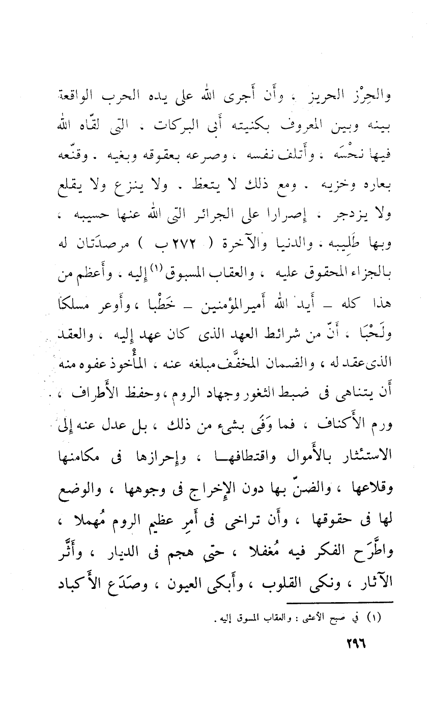 والحرز الحريز وَأَن أجْرى الله على يَده الْحَرْب الْوَاقِعَة بَينه وَبَين الْمَعْرُوف بكنيته أبي البركات الَّتِي لقاه الله فِيهَا نحسه وأتلف نَفسه وصرعه بعقوقه وبغيه وقنعه بعاره وخزيه وَمَعَ ذَلِك لَا يتعظ وَلَا ينْزع وَلَا يقْلع وَلَا يزدجر إصرارا على الجرائر الَّتِي الله عَنْهَا حسيبه وَبهَا طليبه وَالدُّنْيَا وَالْآخِرَة مرصدتان لَهُ بالجزاء المحقوق عَلَيْهِ وَالْعِقَاب الْمَسْبُوق إِلَيْهِ وَأعظم من هَذَا كُله أيد الله أَمِير الْمُؤمنِينَ خطبا وأوعر مسلكا ولحبا أَن من شَرَائِط الْعَهْد الَّذِي كَانَ عهد إِلَيْهِ وَالْعقد الَّذِي عقد لَهُ وَالضَّمان المخفف مبلغه عَنهُ الْمَأْخُوذ عَفوه مِنْهُ أَن يتناهى فِي ضبط الثغور وَجِهَاد الرّوم وَحفظ الْأَطْرَاف ورم الأكناف فَمَا وفى بِشَيْء من ذَلِك بل عدل عَنهُ إِلَى الاستئثار بالأموال واقتطافها وإحرازها فِي مكامنها وقلاعها والضن بهَا دون الْإِخْرَاج فِي وجوهها والوضع لَهَا فِي حُقُوقهَا وَأَن ترَاخى فِي أَمر عَظِيم الرّوم مهملا واطرح الْفِكر فِيهِ مغفلا حَتَّى هجم فِي الديار وَأثر الْآثَار وَنكى الْقُلُوب وأبكى الْعُيُون وصدع الأكباد