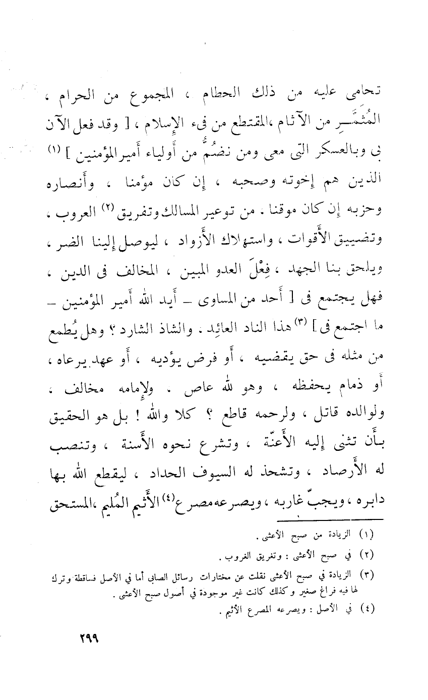 تحامى عَلَيْهِ من ذَلِك الحطام الْمَجْمُوع من الْحَرَام المثمر من الآثام المقتطع من فئ الْإِسْلَام وَقد فعل الْآن بِي وبالعسكر الَّتِي معي وَمن نضم من أَوْلِيَاء أَمِير الْمُؤمنِينَ الَّذين هم إخْوَته وَصَحبه إِن كَانَ مُؤمنا وأنصاره وَحزبه إِن كَانَ موقنا من توعير المسالك وتفريق العروب وتضييق الأقوات واستهلاك الأزواد ليوصل إِلَيْنَا الضّر وَيلْحق بِنَا الْجهد فعل الْعَدو الْمُبين الْمُخَالف فِي الدّين فَهَل يجْتَمع فِي أحد المساوى أيد الله أَمِير الْمُؤمنِينَ مَا اجْتمع فِي هَذَا الناد الْعَائِد والشاذ الشارد وَهل يطْمع من مثله فِي حق يَقْضِيه أَو فرض يُؤَدِّيه أَو عهد يرعاه أَو ذمام يحفظه وَهُوَ لله عَاص ولإمامه مُخَالف ولوالده قَاتل ولرحمه قَاطع كلا وَالله بل هُوَ الْحقيق بِأَن تثنى إِلَيْهِ الأعنة وتشرع نَحوه الأسنة وتنصب لَهُ الأرصاد وتشحذ لَهُ السيوف الْحداد ليقطع الله بهَا دابره وَيجب غاربه ويصرعه مصرع الأثيم المليم الْمُسْتَحق
