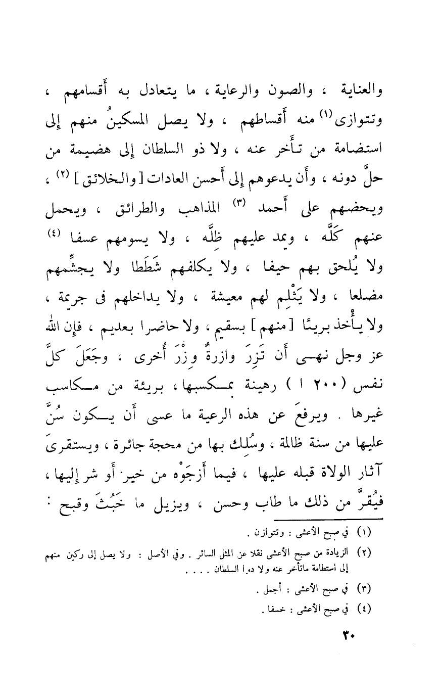 والعناية والصون وَالرِّعَايَة مَا يتعادل بِهِ أقسامهم وتتوازي مِنْهُ أقساطهم وَلَا يصل الْمِسْكِين مِنْهُم إِلَى استضامة من تَأَخّر عَنهُ وَلَا ذُو السُّلْطَان إِلَى هضيمة من حل دونه وَأَن يَدعُوهُم إِلَى أحسن الْعَادَات وَالْخَلَائِق ويحضهم على أَحْمد الْمذَاهب والطرائق وَيحمل عَنْهُم كُله ويمد عَلَيْهِم ظله وَلَا يسومهم عسفا وَلَا يلْحق بهم حيفا وَلَا يكلفهم شططا وَلَا يجشمهم مضلعا وَلَا يثلم لَهُم معيشة وَلَا يداخلهم فِي جريمة وَلَا يَأْخُذ بَرِيئًا مِنْهُم بسقيم وَلَا حَاضرا بعديم فَإِن الله عز وَجل نهى أَن تزر وَازِرَة وزر أُخْرَى وَجعل كل نفس 200 أرهينة بمكسبها بريئة من مكاسب غَيرهَا وَيرْفَع عَن هَذِه الرّعية مَا عَسى أَن يكون سنّ عَلَيْهَا من سنة ظالمة وسلك بهَا من محجة جائرة ويستقري آثَار الْوُلَاة قبله عَلَيْهَا فِيمَا أزجوه من خير أَو شَرّ إِلَيْهَا فَيقر من ذَلِك مَا طَابَ وَحسن ويزيل مَا خبث وقبح