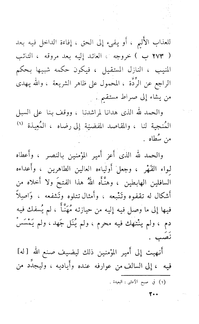 وَالْحَمْد لله الَّذِي أعز أَمِير الْمُؤمنِينَ بالنصر وَأَعْطَاهُ لِوَاء الْقَهْر وَجعل أولياءه العالين الطاهرين وأعداءه السافلين الهابطين وهنأه الله هَذَا الْفَتْح وَلَا أخلاه من أشكال لَهُ تقفوه وتتبعه وأمثال تتلوه وتشفعه واصلا فِيهَا إِلَيّ فأوصل فِيهِ إِلَيْهِ من حيازته مهنأ لم يسفك فِيهِ دم وَلم ينتهك فِيهِ محرم وَلم ينل جهد وَلم يمسس نصب