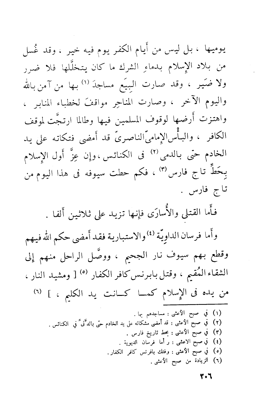 يوميها بل لَيْسَ من أَيَّام الْكفْر يَوْم فِيهِ خير وَقد عسل من بِلَاد الْإِسْلَام بدماء الشّرك مَا كَانَ يتخللها فَلَا ضَرَر وَلَا ضير وَقد صَارَت البيع مَسَاجِد بهَا من آمن بِاللَّه وَالْيَوْم الآخر وَصَارَت المناحر مَوَاقِف لخطباء المنابر واهتزت أرْضهَا لوقوف الْمُسلمين فِيهَا وطالما ارتجت لموقف الْكَافِر والبأس الإمامي الناصري قد أمضى فتكاته على يَد الْخَادِم حَتَّى بالدمى فِي الْكَنَائِس وَإِن عز أول الْإِسْلَام بحط تَاج فَارس فكم حطت سيوفه فِي هَذَا الْيَوْم من تَاج فَارس