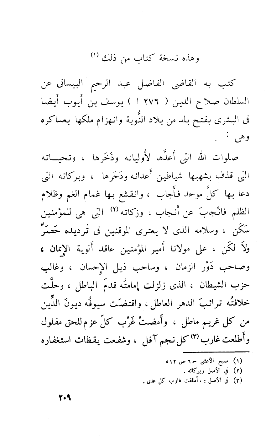 كتب بِهِ القَاضِي الْفَاضِل عبد الرَّحِيم البيساني عَن السُّلْطَان صَلَاح الدّين يُوسُف بن أَيُّوب أَيْضا فِي الْبُشْرَى بِفَتْح بلد من بِلَاد النّوبَة وانهزام ملكهَا بعساكره وَهِي