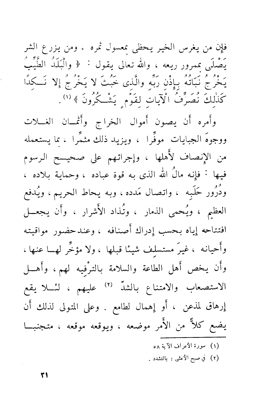 وَأمره أَن يصون أَمْوَال الْخراج وأثمان الغلات ووجوه الجبايات موفرا وَيزِيد ذَلِك مثمرا بِمَا يَسْتَعْمِلهُ من الْإِنْصَاف لأَهْلهَا وإجرائهم على صَحِيح الرسوم فِيهَا فَإِنَّهُ مَال الله الَّذِي بِهِ قُوَّة عبَادَة وحماية بِلَاده ودرور حلبه واتصال مدده وَبِه يحاط الْحَرِيم وَيدْفَع الْعَظِيم ويحمى الذمار وتذاد الأشرار وَأَن يَجْعَل افتتاحه إِيَّاه بِحَسب إِدْرَاك أصنافه وَعند حُضُور مواقيته وأحيانه غير مستسلف شَيْئا قبلهَا وَلَا مُؤخر لَهَا عَنْهَا وَأَن يخص أهل الطَّاعَة والسلامة بالترفيه لَهُم وَأهل الاستصعاب والامتناع بالشد عَلَيْهِ لِئَلَّا يَقع إرهاق لمذعن أَو إهمال لطامع وعَلى المتولى لذَلِك أَن يضع كلا من الْأَمر مَوْضِعه ويوقعه موقعه متجنبا