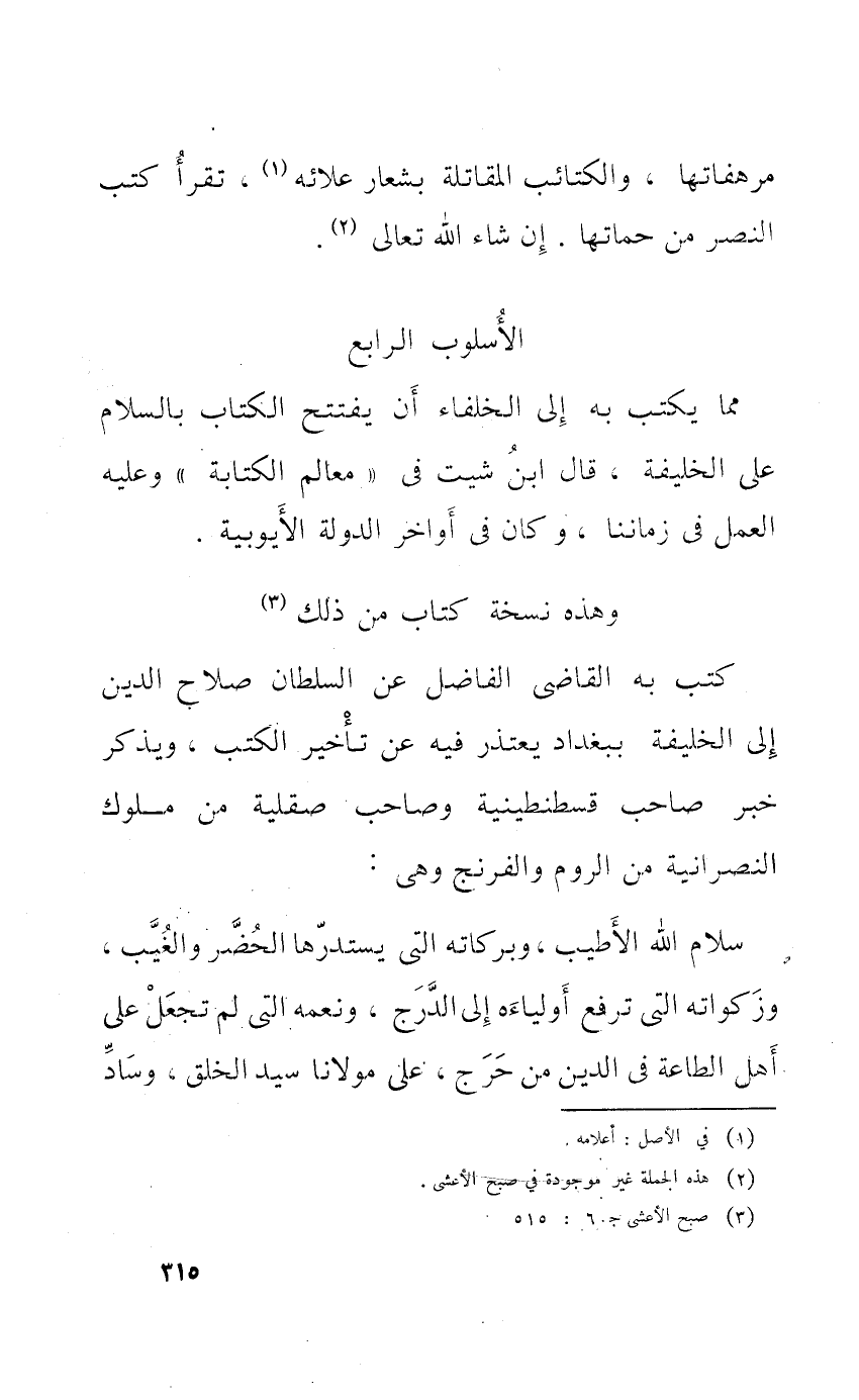 مِمَّا يكْتب بِهِ إِلَى الْخُلَفَاء أَن يفْتَتح الْكتاب بِالسَّلَامِ على الْخَلِيفَة قَالَ ابْن شيت فِي معالم الْكِتَابَة وَعَلِيهِ الْعَمَل فِي زَمَاننَا وَكَانَ فِي أَوَاخِر الدولة الأيوبية