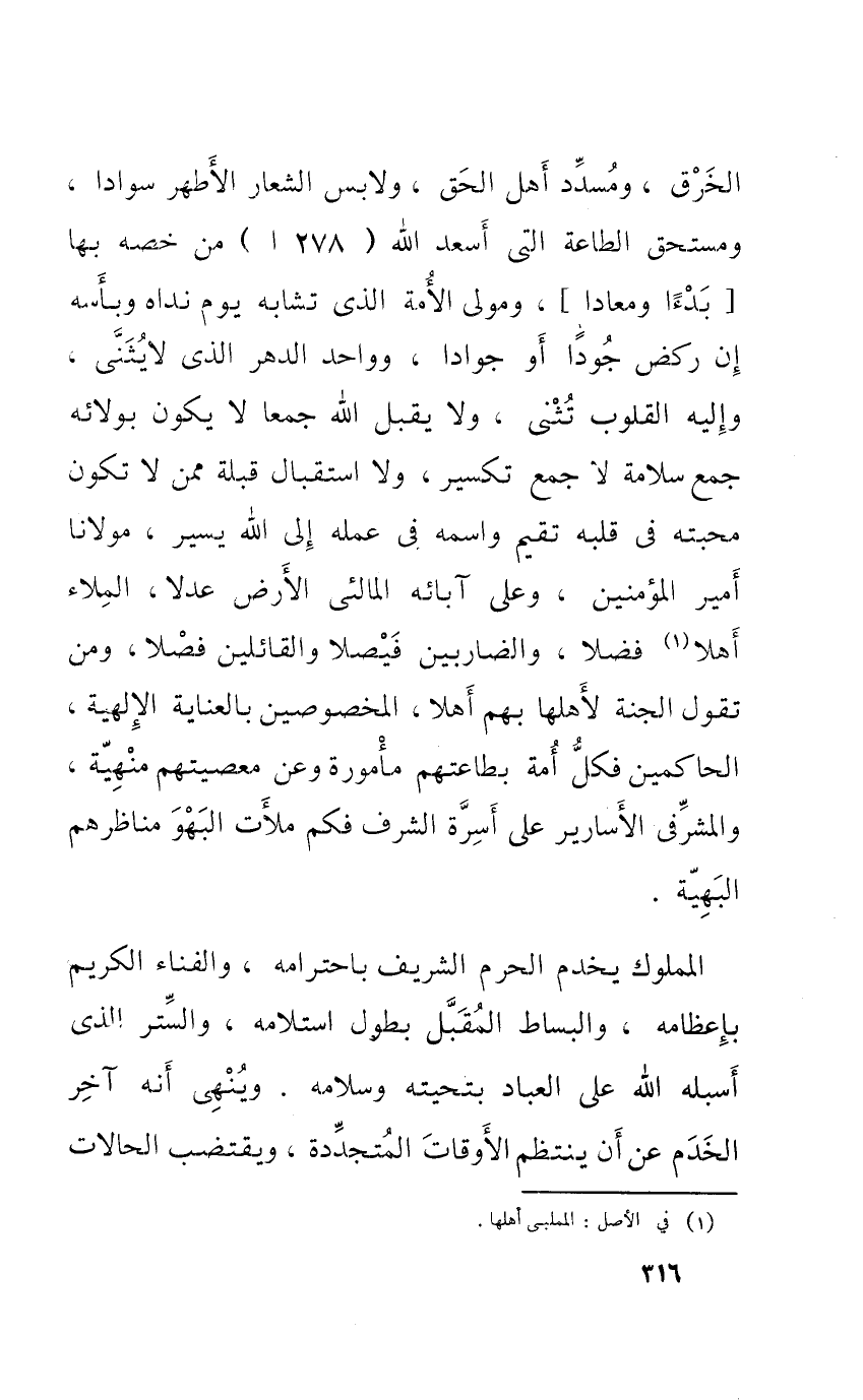 الْخرق ومسدد أهل الْحق ولابس الشعار الأطهر سوادا ومستحق الطَّاعَة الَّتِي أسعد الله من خصّه بهَا بدءا ومعادا وَمولى الْأمة الَّذِي تشابه يَوْم نداه وباسه إِن ركض جودا أَو جوادا وَوَاحِد الدَّهْر الَّذِي لَا يثنى وَإِلَيْهِ الْقُلُوب تثنى وَلَا يقبل الله جمعا لَا يكون بولائه جمع سَلامَة لَا جمع تكسير وَلَا اسْتِقْبَال قبْلَة مِمَّن لَا تكون محبته فِي قلبه تقيم واسْمه فِي عمله إِلَى الله يسير مَوْلَانَا أَمِير الْمُؤمنِينَ وعَلى آبَائِهِ المالئي الأَرْض عدلا الملاء أَهلا فضلا والضاربين فيصلا والقائلين فصلا وَمن تَقول الْجنَّة لأَهْلهَا بهم أَهلا المخصوصين بالعناية الإلهية الْحَاكِمين فَكل أمة بطاعتهم مأمورة وَعَن معصيتهم منهية والمشرفى الأسارير على أسرة الشّرف فكم مَلَأت البهو مناظرهم البهية