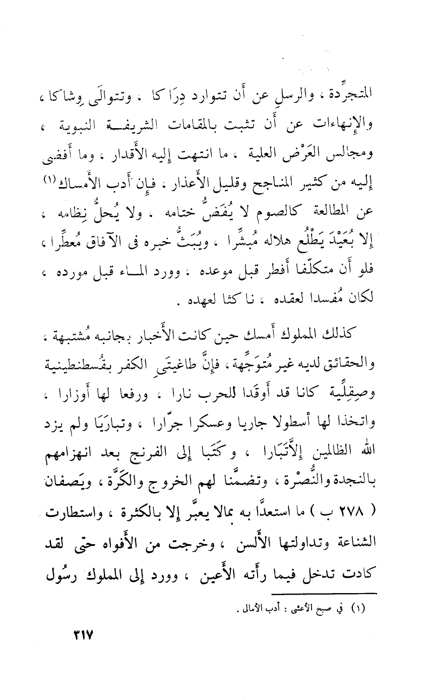 المتجردة وَالرسل عَن أَن تتوارد دراكا وتتوالى وشاكا والإنهاءات عَن أَن تثبت بالمقامات الشَّرِيفَة النَّبَوِيَّة ومجالس الْعرض الْعلية مَا انْتَهَت إِلَيْهِ الأقدار وَمَا أفْضى إِلَيْهِ من كثير المناجح وَقَلِيل الْأَعْذَار فَإِن أدب الأمساك عَن المطالعة كَالصَّوْمِ لَا يفض ختامه وَلَا يحل نظامه إِلَّا بعيد يطلع هلاله مبشرا ويبث خَبره فِي الْآفَاق معطرا فَلَو أَن متكلفا أفطر قبل موعده وَورد المَاء قبل مورده لَكَانَ مُفْسِدا لعقده نَاكِثًا لعهده