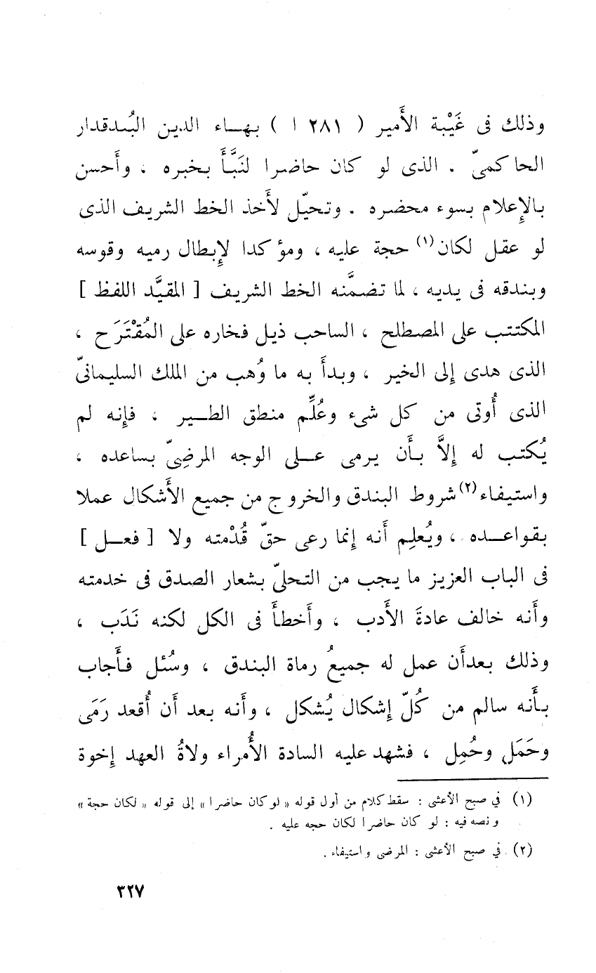 وَذَلِكَ فِي غيبَة الْأَمِير بهاء الدّين البندقدار الحاكمي الَّذِي لَو كَانَ حَاضرا لنبأ بِخَبَرِهِ وَأحسن بالإعلام بِسوء محضره وتحيل لأخذ الْخط الشريف الَّذِي لَو عقل لَكَانَ حجَّة عَلَيْهِ ومؤكدا لإبطال رميه وقوسه وبندقه فِي يَدَيْهِ لما تضمنه الْخط الشريف الْمُقَيد اللَّفْظ المكتتب على المصطلح الساحب ذيل فخاره على المقترح الَّذِي هدى إِلَى الْخَيْر وَبَدَأَ بِهِ مَا وهب من الْملك السُّلَيْمَانِي الَّذِي أُوتِيَ من كل شَيْء وَعلم منطق الطير فَإِنَّهُ لم يكْتب لَهُ إِلَّا بِأَن يَرْمِي على الْوَجْه المرضي بساعده وَاسْتِيفَاء شُرُوط البندق وَالْخُرُوج من جَمِيع الأشكال عملا بقواعده وَيعلم أَنه إِنَّمَا رعى حق قَدمته وَلَا فعل فِي الْبَاب الْعَزِيز مَا يجب من التحلي بشعار الصدْق فِي خدمته وَأَنه خَالف عَادَة الْأَدَب وَأَخْطَأ فِي الْكل لكنه ندب وَذَلِكَ بعد أَن عمل لَهُ جيمع رُمَاة البندق وَسُئِلَ فَأجَاب بِأَنَّهُ سَالم من كل إِشْكَال يشكل وَأَنه بعد أَن أقعد رمى وَحمل وَحمل فَشهد عَلَيْهِ السَّادة الْأُمَرَاء وُلَاة الْعَهْد إخْوَة
