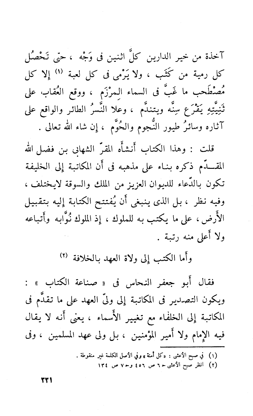 قلت وَهَذَا الْكتاب أنشأه الْمقر الشهابي بن فضل الله الْمُقدم ذكره بِنَاء على مذْهبه فِي أَن الْمُكَاتبَة إِلَى الْخَلِيفَة تكون بِالدُّعَاءِ للديوان الْعَزِيز من الْملك والسوقة لَا يخْتَلف وَفِيه نظر بل الَّذِي يَنْبَغِي أَن يفْتَتح الْكِتَابَة إِلَيْهِ بتقبيل الأَرْض على مَا يكْتب بِهِ للملوك إِذْ الْمُلُوك نوابه وَأَتْبَاعه وَلَا أَعلَى مِنْهُ رُتْبَة
