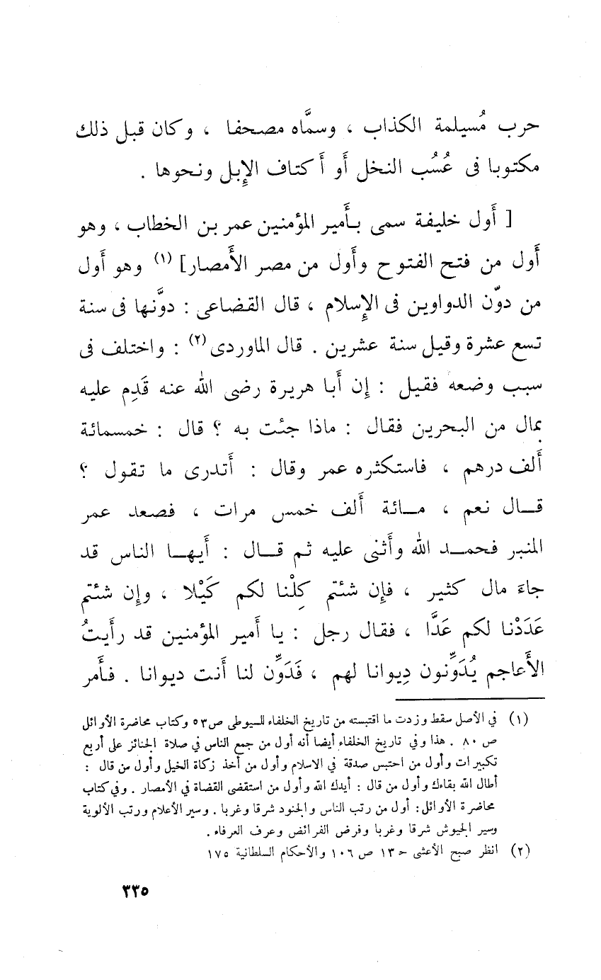 أول خَليفَة سمى بأمير الْمُؤمنِينَ عمر بن الْخطاب وَهُوَ أول من فتح الْفتُوح وَأول من مصر الْأَمْصَار وَهُوَ أول من دون الدَّوَاوِين فِي الْإِسْلَام قَالَ الْقُضَاعِي دونهَا فِي سنة تسع عشرَة وَقيل سنة عشْرين قَالَ الْمَاوَرْدِيّ وَاخْتلف فِي سَبَب وَضعه فَقيل إِن أَبَا هُرَيْرَة رَضِي الله عَنهُ قدم عَلَيْهِ بِمَال من الْبَحْرين فَقَالَ مَاذَا جِئْت بِهِ قَالَ خَمْسمِائَة ألف دِرْهَم فاستكثره عمر وَقَالَ أَتَدْرِي مَا تَقول قَالَ نعم مائَة ألف خمس مَرَّات فَصَعدَ عمر الْمِنْبَر فَحَمدَ الله وَأثْنى عَلَيْهِ ثمَّ قَالَ أَيهَا النَّاس قد جَاءَ مَال كثير فَإِن شِئْتُم كلنا لكم كَيْلا وَإِن شِئْتُم عددنا لكم عدا فَقَالَ رجل يَا أَمِير الْمُؤمنِينَ قد رَأَيْت الْأَعَاجِم يدونون ديوانا لَهُم قدون لنا أَنْت ديوانا فَأمر