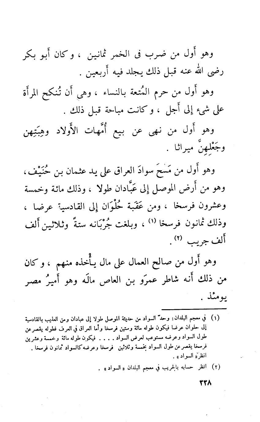وَهُوَ أول من مسح سَواد الْعرَاق على يَد عُثْمَان بن حنيف وَهُوَ من أَرض الْموصل إِلَى عبادان طولا وَذَلِكَ مائَة وَخمْس وَعِشْرُونَ فرسخا وَمن عقبَة حلوان إِلَى الْقَادِسِيَّة عرضا وَذَلِكَ ثَمَانُون فرسخا وَبَلغت جربانه سِتَّة وَثَلَاثِينَ ألف ألف جريب