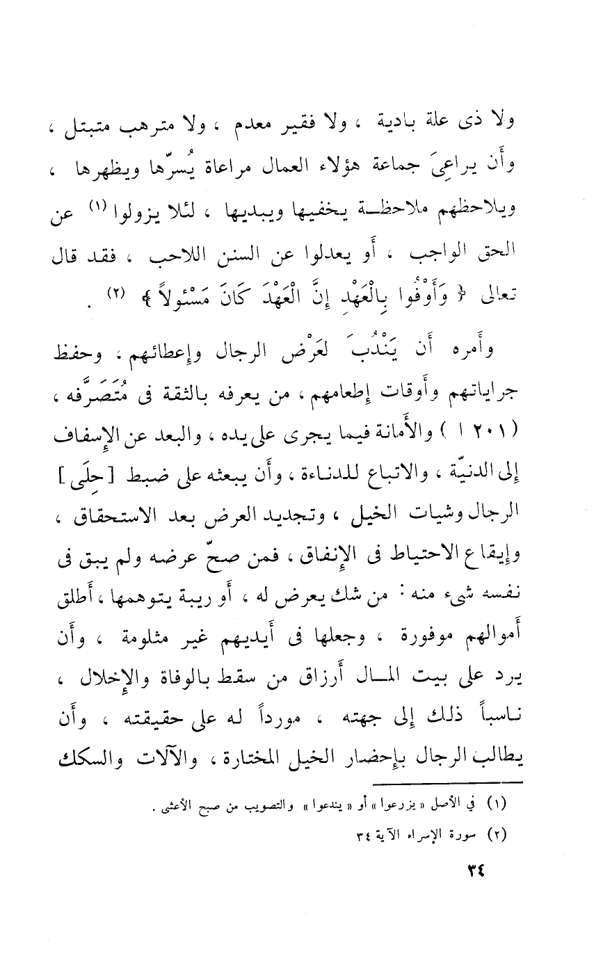وَلَا ذِي عِلّة بادية وَلَا فَقير معدم وَلَا مترهب متبتل وَأَن يُرَاعِي جمَاعَة هَؤُلَاءِ الْعمَّال مُرَاعَاة يسرها ويظهرها ويلاحظهم مُلَاحظَة يخفيها ويبديها لِئَلَّا يزولوا عَن الْحق الْوَاجِب أَو يعدلُوا عَن السّنَن اللاحب فقد قَالَ تَعَالَى {وأوفوا بالعهد إِن الْعَهْد كَانَ مسؤولا}