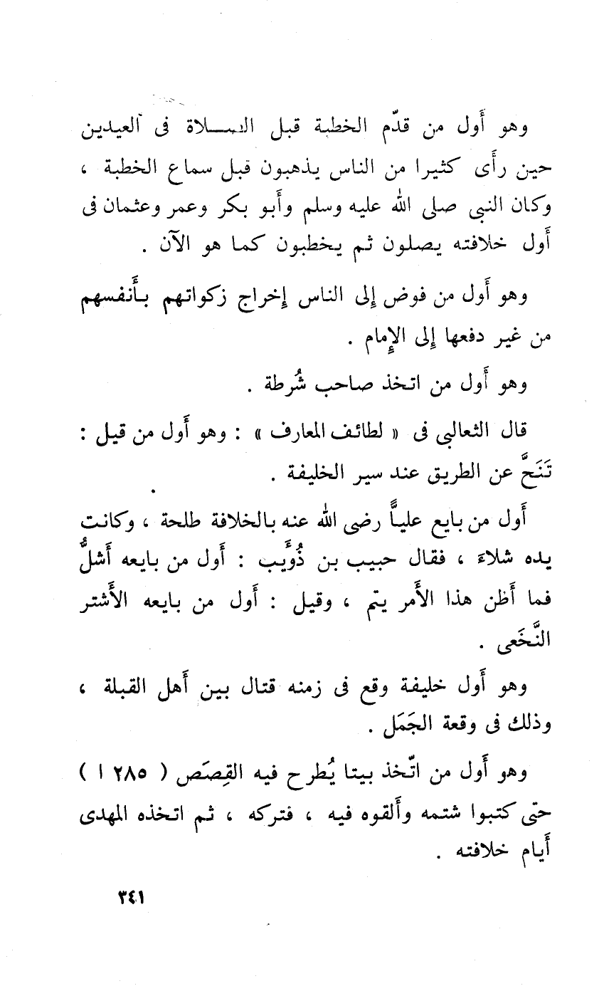 وَهُوَ أول من قدم الْخطْبَة قبل الصَّلَاة فِي الْعِيدَيْنِ حِين رأى كثيرا من النَّاس يذهبون قبل سَماع الْخطْبَة وَكَانَ النَّبِي صلى الله عَلَيْهِ وَسلم وَأَبُو بكر وَعمر وَعُثْمَان فِي أول خِلَافَته يصلونَ ثمَّ يخطبون كَمَا هُوَ الْآن