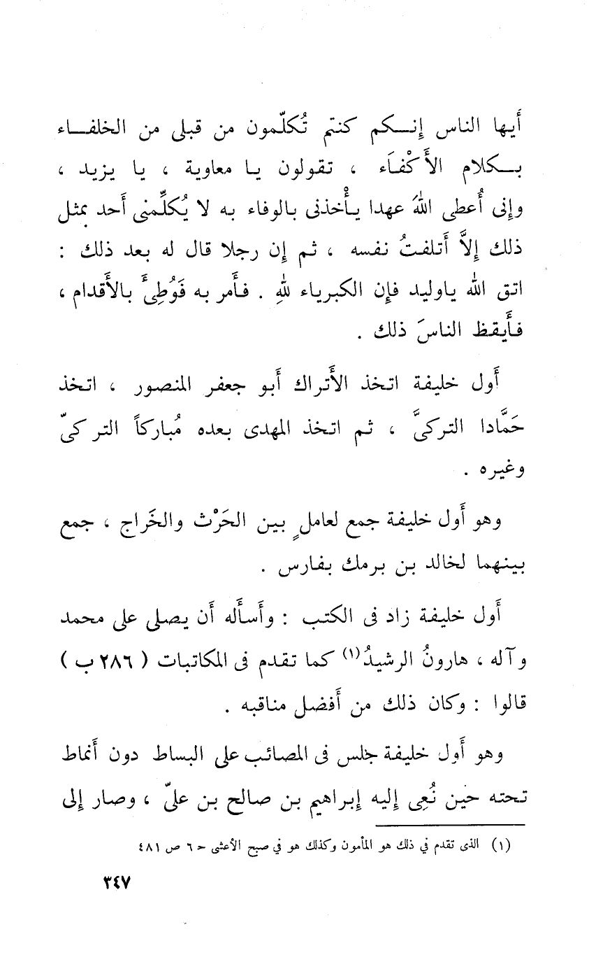 أول خَليفَة زَاد فِي الْكتب وأسأله أَن يُصَلِّي على مُحَمَّد وَآله هَارُون الرشيد كَمَا تقدم فِي المكاتبات قَالُوا وَكَانَ ذَلِك من أفضل مناقبه