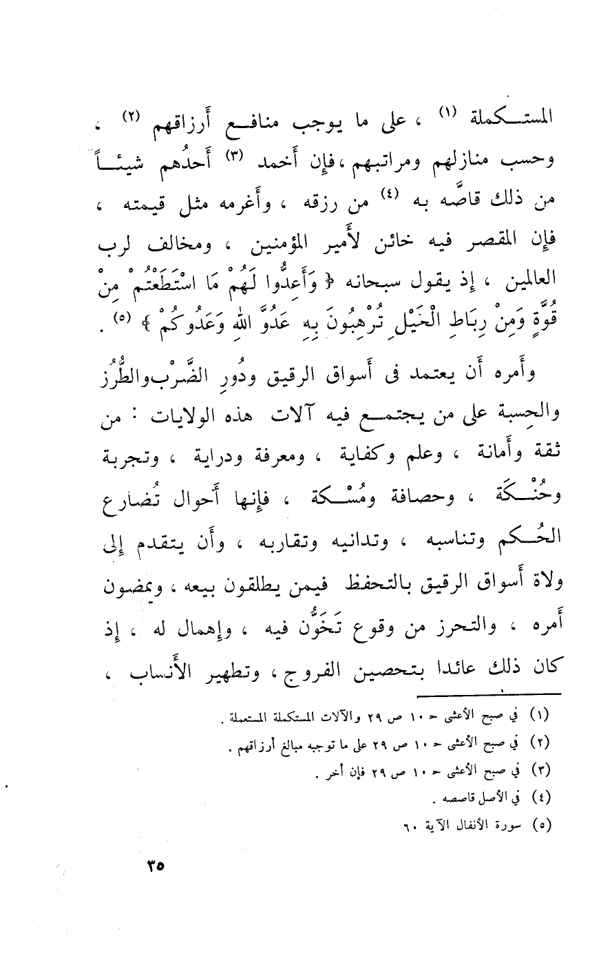 المستكملة على مَا يُوجب مَنَافِع أَرْزَاقهم وَحسب مَنَازِلهمْ ومراتبهم فَإِن أخمد أحدهم شَيْئا من ذَلِك قاصه بِهِ من رزقه وأغرمه مثل قِيمَته فَإِن المقصر فِيهِ خائن لأمير الْمُؤمنِينَ ومخالف لرب الْعَالمين إِذْ يَقُول سُبْحَانَهُ {وَأَعدُّوا لَهُم مَا اسْتَطَعْتُم من قُوَّة وَمن رِبَاط الْخَيل ترهبون بِهِ عَدو الله وَعَدُوكُمْ}