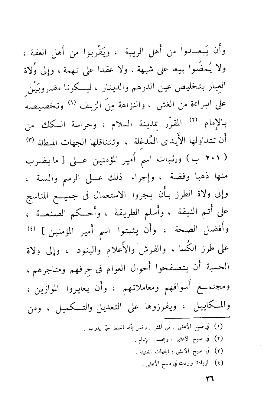 وَأَن يبعدوا من أهل الرِّيبَة ويقربوا من أهل الْعِفَّة وَلَا يمضوا بيعا على شُبْهَة وَلَا عقدا على تُهْمَة وَإِلَى وُلَاة الْعيار بتخليص عين الدِّرْهَم وَالدِّينَار ليكونا مضروبين على الْبَرَاءَة من الْغِشّ والنزاهة من الزيف وتخصيصه بِالْإِمَامِ الْمُقَرّر بِمَدِينَة السَّلَام وحراسة السكَك من أَن تتداولها الْأَيْدِي المدغلة وتتناقلها الْجِهَات المبطلة 201 ب وَإِثْبَات اسْم أَمِير الْمُؤمنِينَ على مَا يضْرب مِنْهَا ذَهَبا وَفِضة وإجراء ذَلِك على الرَّسْم وَالسّنة وَإِلَى وُلَاة الطرز بِأَن يجروا الِاسْتِعْمَال فِي جَمِيع المناسج على أتم النيقة وَأسلم الطَّرِيقَة وَأحكم الصَّنْعَة وَأفضل الصِّحَّة وَأَن يثبتوا اسْم أَمِير المؤم على طرز الكسا والفرش والأعلام والبنود وَإِلَى وُلَاة الْحِسْبَة أَن يتصفحوا أَحْوَال الْعَوام فِي حرفهم ومتاجرهم ومجتمع أسواقهم ومعاملاتهم وَأَن يعايروا الموازين والمكاييل ويفرزوها على التَّعْدِيل والتكميل وَمن