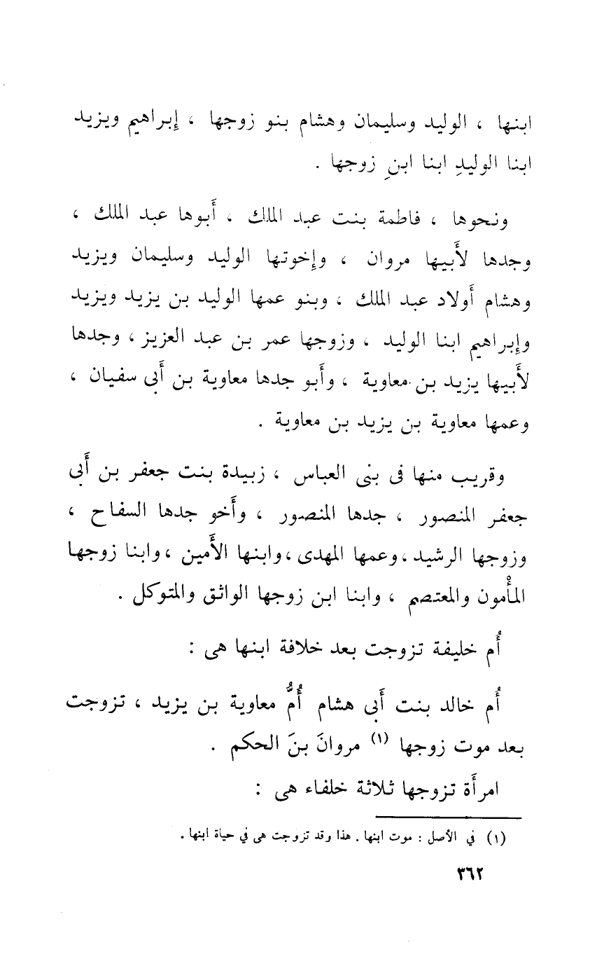 وَنَحْوهَا فَاطِمَة بنت عبد الْملك أَبوهَا عبد الْملك وجدهَا لأَبِيهَا مَرْوَان وإخوتها الْوَلِيد وَسليمَان وَيزِيد وَهِشَام أَوْلَاد عبد الْملك وَبَنُو عَمها الْوَلِيد بن يزِيد وَيزِيد وابراهيم ابْنا الْوَلِيد وَزوجهَا عمر بن عبد الْعَزِيز وجدهَا لأَبِيهَا يزِيد بن مُعَاوِيَة وَأَبُو جدها مُعَاوِيَة بن أبي سُفْيَان وعمها مُعَاوِيَة بن يزِيد بن مُعَاوِيَة