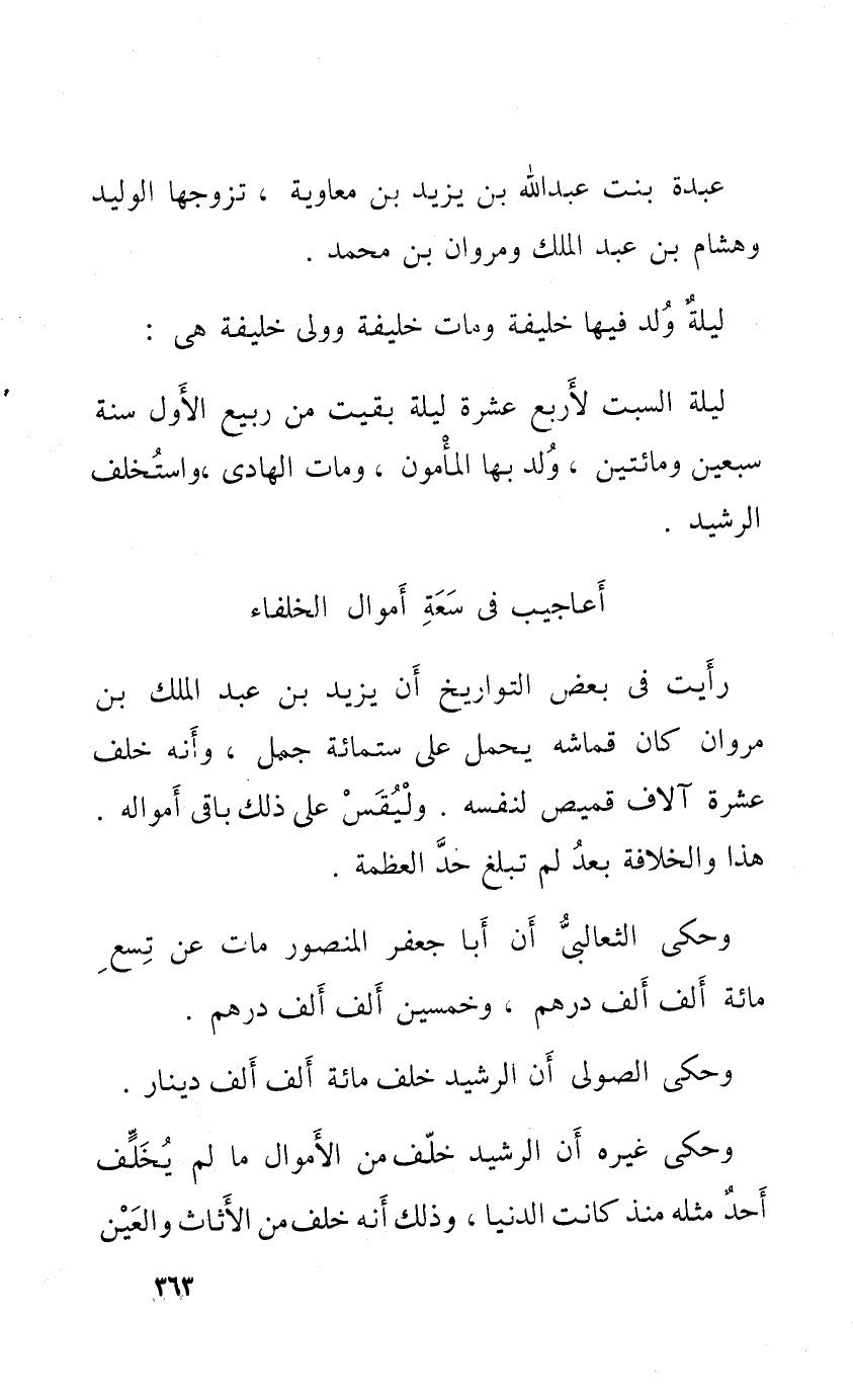 رَأَيْت فِي بعض التواريخ أَن يزِيد بن عبد الْملك بن مَرْوَان كَانَ قماشه يحمل على سِتّمائَة جمل وَأَنه خلف عشرَة آلَاف قَمِيص لنَفسِهِ وليقس على ذَلِك بَاقِي أَمْوَاله هَذَا والخلافة بعد لم تبلغ حد العظمة