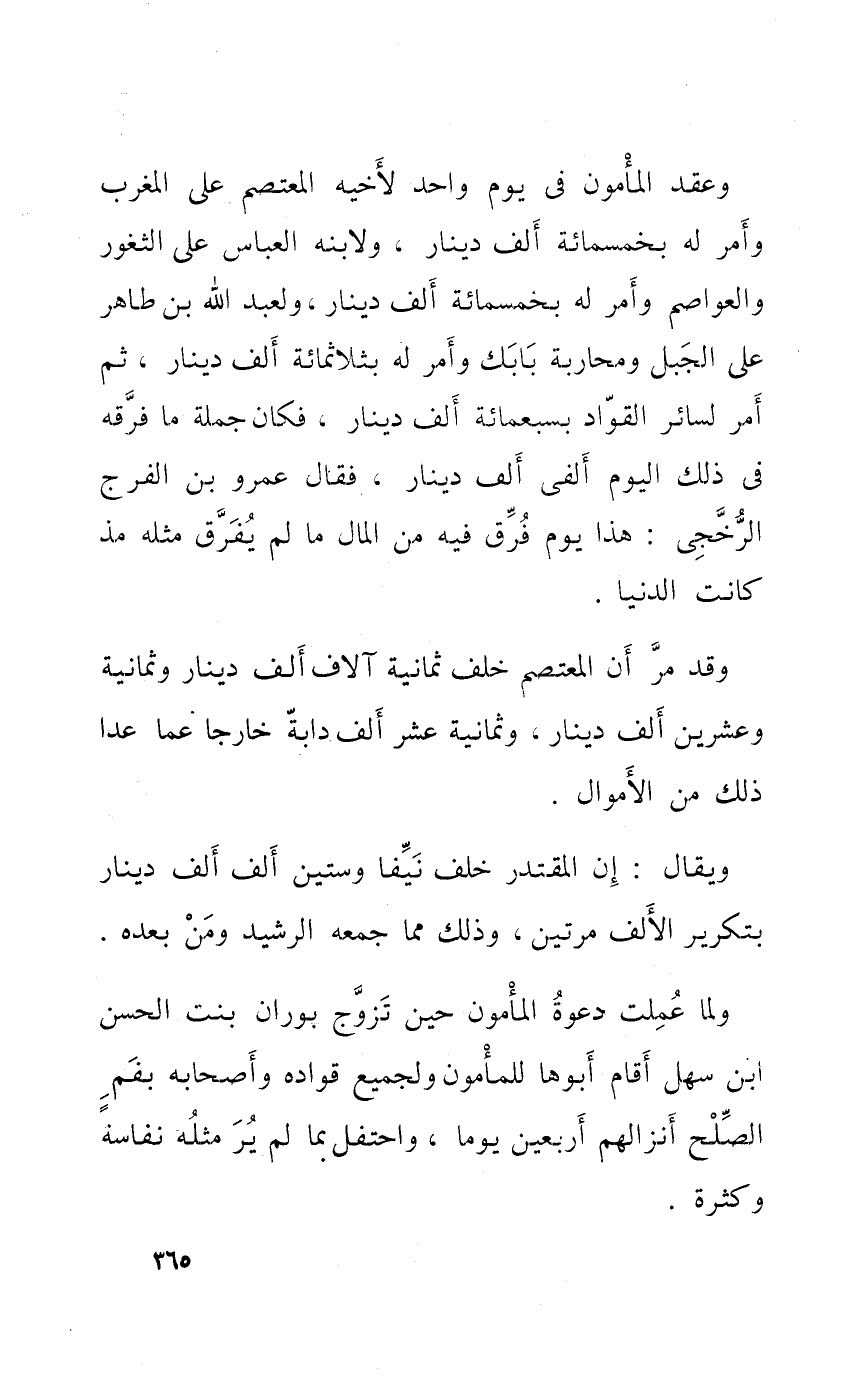 وَعقد الْمَأْمُون فِي يَوْم وَاحِد لِأَخِيهِ المعتصم على الْمغرب وَأمر لَهُ بِخَمْسِمِائَة ألف دِينَار ولابنه الْعَبَّاس على الثغور والعواصم وَأمر لَهُ بِخَمْسِمِائَة ألف دِينَار ولعَبْد الله بن طَاهِر على الْجَبَل ومحاربة بابك وَأمر لَهُ بثلاثمائة ألف دِينَار ثمَّ أَمر لسَائِر القواد بسبعمائة ألف دِينَار فَكَانَ جملَة مَا فرقه فِي ذَلِك الْيَوْم ألفي ألف دِينَار فَقَالَ عَمْرو بن الْفرج الرخجي هَذَا يَوْم فرق فِيهِ من المَال مَا لم يفرق مثله مذ كَانَت الْحَيَاة