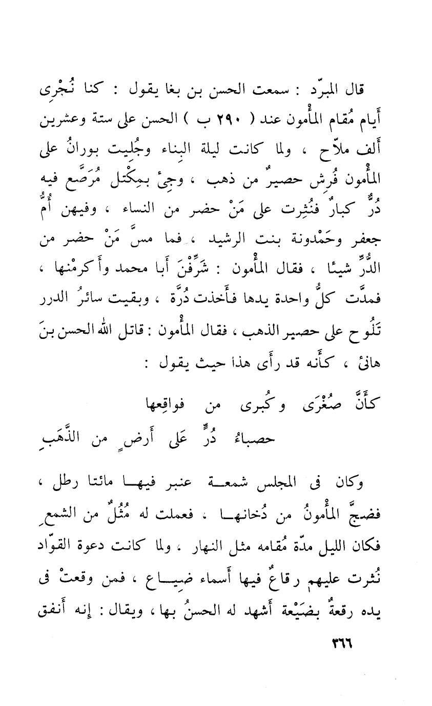 قَالَ الْمبرد سَمِعت الْحسن بن بغا يَقُول كُنَّا نجري أَيَّام مقَام الْمَأْمُون عِنْد الْحسن على سِتَّة وَعشْرين ألف ملاح وَلما كَانَت لَيْلَة الْبناء وجليت بوران على الْمَأْمُون فرش حَصِير من ذهب وجئ بمكتل مرصع فِيهِ در كبار فَنثرَتْ على من حضر من النِّسَاء وفيهن أم جَعْفَر وحمدونة بنت الرشيد فَمَا مس من حصر من الدّرّ شَيْئا فَقَالَ الْمَأْمُون شرفن أَبَا مُحَمَّد وأكرمنها فمدت كل وَاحِدَة يَدهَا فَأخذت درة وَبقيت سَائِر الدُّرَر تلوح على حَصِير الذَّهَب فَقَالَ الْمَأْمُون قَاتل الله الْحسن بن هَانِئ كَأَنَّهُ قد رأى هَذَا حَيْثُ يَقُول ... كَأَن صغرى وكبرى من فواقعها