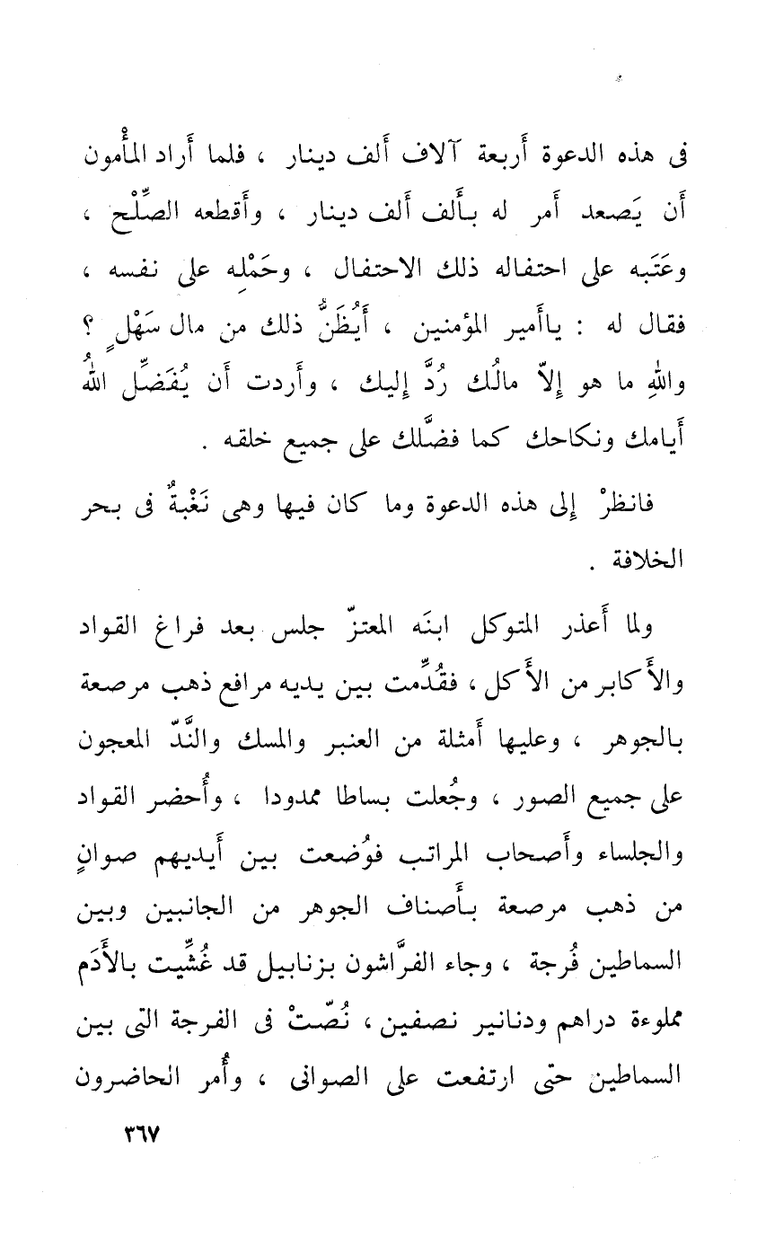 وَلما أعذر المتَوَكل ابْنه المعتز جلس بعد فرَاغ القواد والأكابر من الْأكل فَقدمت بَين يَدَيْهِ مرافع ذهب مرصعة بالجوهر وَعَلَيْهَا أَمْثِلَة من العنبر والمسك والند المعجون على جَمِيع الصُّور وَجعلت بساطا ممدودا وأحضر القواد والجلساء وَأَصْحَاب الْمَرَاتِب فَوضعت بَين أَيْديهم صوان من ذهب مرصعة بأصناف الْجَوْهَر من الْجَانِبَيْنِ وَبَين السماطين فُرْجَة وَجَاء الفراشون بزنابيل قد غشيت بِالْأدمِ مَمْلُوءَة دَرَاهِم ودنانير نِصْفَيْنِ نصت فِي الفرجة الَّتِي بَين السماطين حَتَّى ارْتَفَعت على الصواني وَأمر الْحَاضِرُونَ