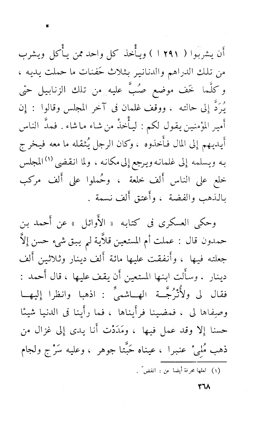 أَن يشْربُوا وَيَأْخُذ كل وَاحِد مِمَّن يَأْكُل وَيشْرب من تِلْكَ الدَّرَاهِم وَالدَّنَانِير بِثَلَاث حفنات مَا حملت يَدَيْهِ وَكلما خف مَوضِع صب عَلَيْهِ من تِلْكَ الزنابيل حَتَّى يرد إِلَى حَالَته ووقف غلْمَان فِي آخر الْمجْلس وَقَالُوا إِن أَمِير الْمُؤمنِينَ يَقُول لكم ليَأْخُذ من شَاءَ مَا شَاءَ فَمد النَّاس أَيْديهم إِلَى المَال فَأَخَذُوهُ وَكَانَ الرجل يثقله مَا مَعَه فَيخرج بِهِ ويسلمه إِلَى غلمانه وَيرجع إِلَى مَكَانَهُ وَلما انْقَضى الْمجْلس خلع على النَّاس ألف خلعة وحملوا على ألف مركب بِالذَّهَب وَالْفِضَّة وَأعْتق ألف نسمَة