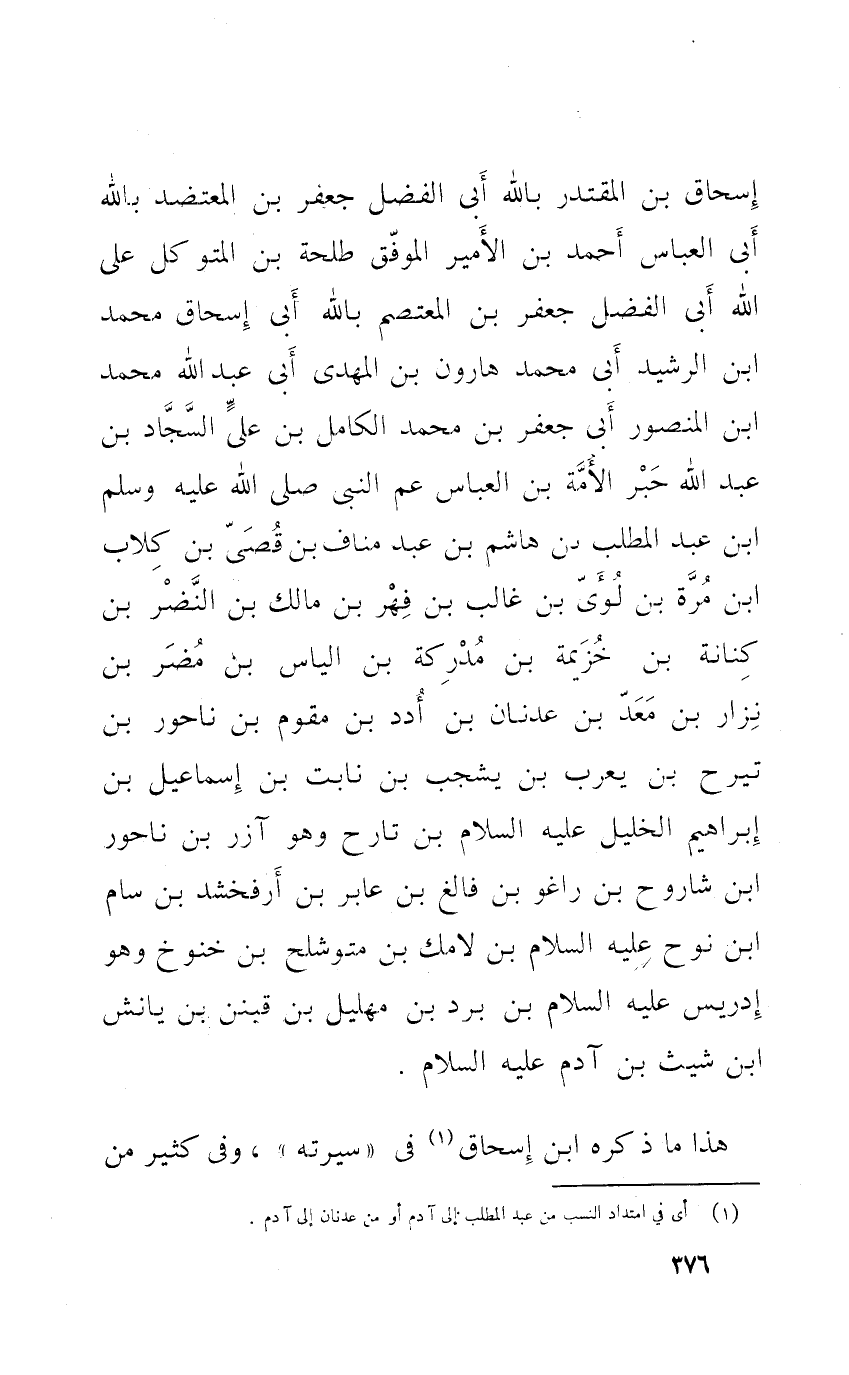 إِسْحَاق بن المقتدر بِاللَّه أبي الْفضل جَعْفَر بن المعتضد بِاللَّه أبي الْعَبَّاس أَحْمد بن الْأَمِير الْمُوفق طَلْحَة بن المتَوَكل على الله أبي الْفضل جَعْفَر بن المعتصم بِاللَّه أبي اسحاق مُحَمَّد بن الرشيد أبي مُحَمَّد هَارُون بن الْمهْدي أبي عبد الله مُحَمَّد بن الْمَنْصُور أبي جَعْفَر بن مُحَمَّد الْكَامِل بن عَليّ السَّجَّاد بن عبد الله حبر الْأمة بن الْعَبَّاس عَم النَّبِي صلى الله عَلَيْهِ وَسلم ابْن عبد الْمطلب بن هَاشم بن عبد منَاف بن قصي بن كلاب ابْن مرّة بن لؤَي بن غَالب بن فهر بن مَالك بن النَّضر بن كنَانَة بن خُزَيْمَة بن مدركة بن الياس بن مُضر بن نزار بن معد بن عدنان بن أدد بن مقوم بن ناحور بن تيرح بن يعرب بن يشجب بن نابت بن اسماعيل بن ابراهيم الْخَلِيل عَلَيْهِ السَّلَام بن تارح وَهُوَ آزر بن ناحور بن شاروح بن راغو بن فالغ بن عَابِر بن أرفخشد بن سَام بن نوح عَلَيْهِ السَّلَام بن لامك بن متوشلح بن خنوخ وَهُوَ ادريس عَلَيْهِ السَّلَام بن برد بن مهليل بن قينن بن يانش بن شِيث بن آدم عَلَيْهِ السَّلَام
