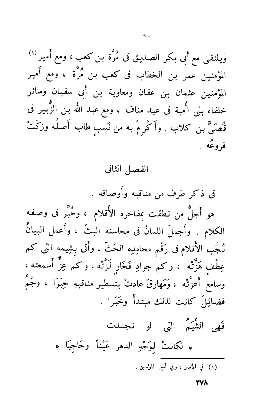 ويلتقي مَعَ أبي بكر الصّديق فِي مرّة بن كَعْب وَمَعَ أَمِير الْمُؤمنِينَ عمر بن الْخطاب فِي كَعْب بن مرّة وَمَعَ أَمِير الْمُؤمنِينَ عُثْمَان بن عَفَّان وَمُعَاوِيَة بن أبي سُفْيَان وَسَائِر خلفاء بني أُميَّة فِي عبد منَاف وَمَعَ عبد الله بن الزبير فِي قصي بن كلاب وَأكْرم بِهِ من نسب طَابَ أَصله وزكت فروعه