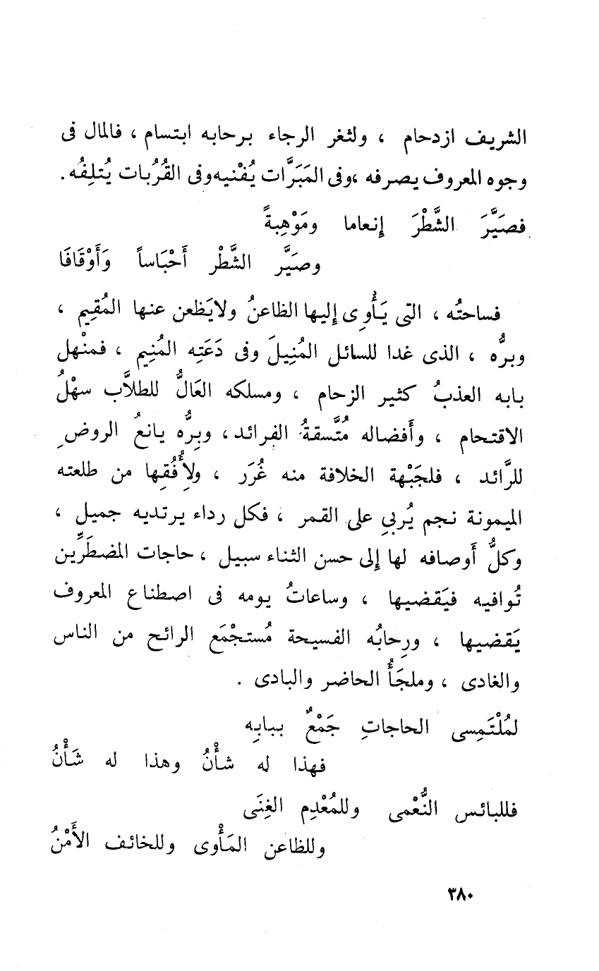 فساحته الَّتِي يأوي إِلَيْهَا الظاعن وَلَا يظعن عَنْهَا الْمُقِيم وبره الَّذِي غَدا للسَّائِل المنيل وَفِي دَعَتْهُ المنيم فمنهل بَابه العذب كثير الزحام ومسلكه العال للطلاب سهل الاقتحام وأفضاله متسقة الفرائد وبره يَانِع الرَّوْض للرائد فلجبهة الْخلَافَة مِنْهُ غرر ولأفقها من طلعته الميمونة نجم يربى على الْقَمَر فَكل رِدَاء يرتديه جميل وكل أَوْصَافه لَهَا إِلَى حسن الثَّنَاء سَبِيل حاجات الْمُضْطَرين توافيه فيقضيها وساعات يَوْمه فِي اصطناع الْمَعْرُوف يَقْضِيهَا ورحابه الفسيحة مستجمع الرَّائِح من النَّاس والغادي وملجأ الْحَاضِر والبادي ... لملتمسي الْحَاجَات جمع بِبَابِهِ