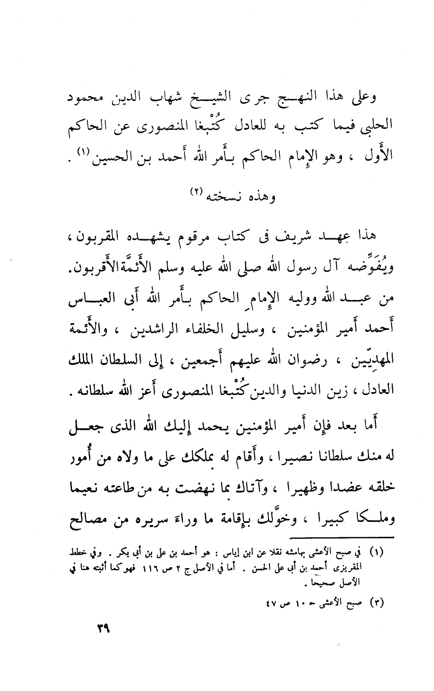 وَعلي هَذَا النهج جرى الشَّيْخ شهَاب الدّين مَحْمُود الْحلَبِي فِيمَا كتب بِهِ للعادل كتبغا المنصوري عَن الْحَاكِم الأول وَهُوَ الإِمَام الْحَاكِم بِأَمْر الله أَحْمد بن الْحُسَيْن