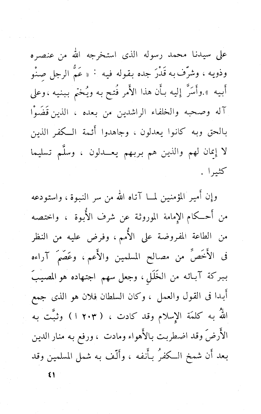 على سيدنَا مُحَمَّد رَسُوله الَّذِي استخرجه الله من عنصره وَذَوِيهِ وَشرف بِهِ قدر جده بقوله فِيهِ عَم الرجل صنو ابيه وَأسر إِلَيْهِ بِأَن هَذَا الْأَمر فتح بِهِ وَيخْتم ببنيه وعَلى آله وَصَحبه وَالْخُلَفَاء الرَّاشِدين من بعده الَّذين قضوا بِالْحَقِّ وَبِه كَانُوا يعدلُونَ وَجَاهدُوا أَئِمَّة الْكفْر الَّذين لَا إِيمَان لَهُم وَالَّذين هم برَبهمْ يعدلُونَ وَسلم تَسْلِيمًا كثيرا