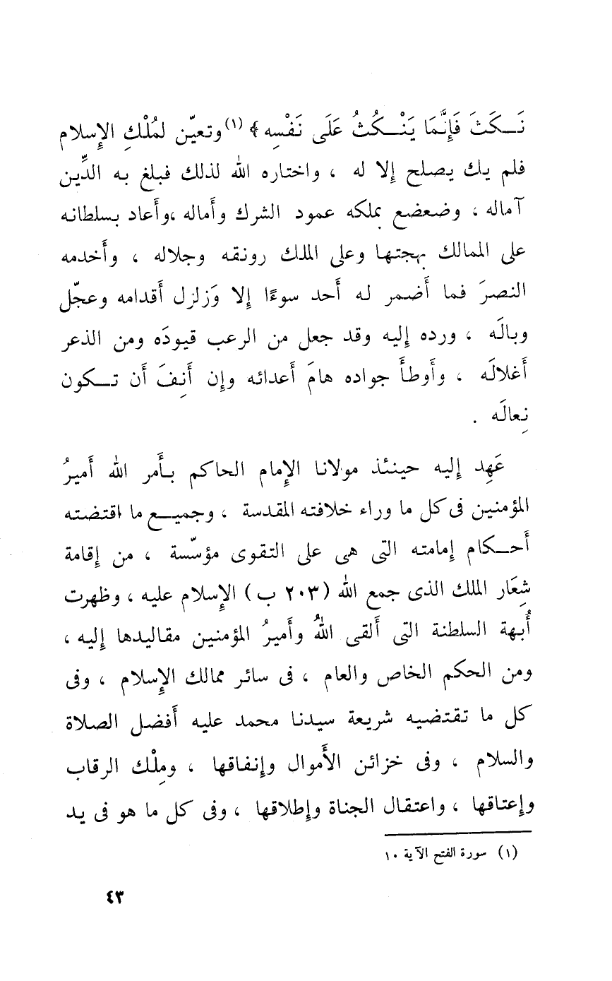 عهد إِلَيْهِ حِينَئِذٍ مَوْلَانَا الإِمَام الْحَاكِم بِأَمْر الله أَمِير الْمُؤمنِينَ فِي كل مَا وَرَاء خِلَافَته المقدسة وَجَمِيع مَا اقتضته أَحْكَام إِمَامَته الَّتِي هِيَ على التَّقْوَى مؤسسة من إِقَامَة شعار الْملك الَّذِي جمع الله 203 ب الْإِسْلَام عَلَيْهِ وَظَهَرت أبهة السلطنة الَّتِي ألْقى الله وأمير الْمُؤمنِينَ مقاليدها إِلَيْهِ وَمن الحكم الْخَاص وَالْعَام فِي سَائِر ممالك الْإِسْلَام وَفِي كل مَا تَقْتَضِيه شَرِيعَة سيدنَا مُحَمَّد عَلَيْهِ أفضل الصَّلَاة وَالسَّلَام وَفِي خَزَائِن الْأَمْوَال وإنفاقها وَملك الرّقاب وإعتاقها واعتقال الجناة وإطلاقها وَفِي كل مَا هُوَ فِي يَد