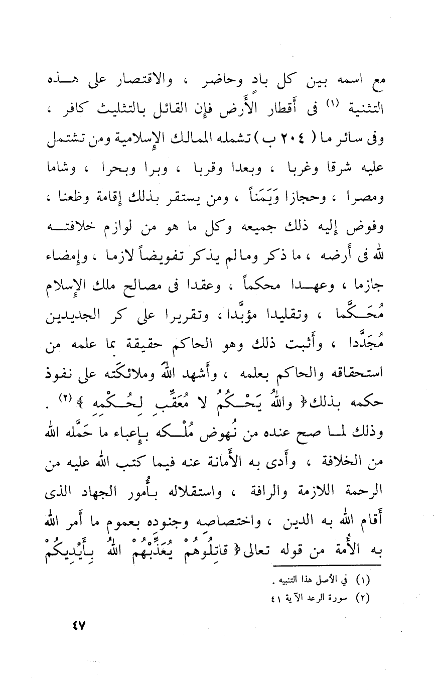 مَعَ اسْمه بَين كل باد وحاضر والاقتصار على هَذِه التَّثْنِيَة فِي أقطار الأَرْض فَإِن الْقَائِل بالتثليث كَافِر وَفِي سَائِر مَا 204 ب تشمله الممالك الإسلامية وَمن تشْتَمل عَلَيْهِ شرقا وغربا وبعدا وقربا وَبرا وبحرا وشاما ومصرا وحجازا ويمنا وَمن يسْتَقرّ بذلك إِقَامَة وظعنا وفوض إِلَيْهِ ذَلِك جَمِيعه وكل مَا هُوَ من لَوَازِم خِلَافَته لله فِي أرضه مَا ذكر وَمَا لم يذكر تفويضا لَازِما وإمضاء جَازِمًا وعهدا محكما وعقدا فِي مصَالح ملك الْإِسْلَام محكما وتقليدا مُؤَبَّدًا وتقريرا على كرّ الجديدين مجددا وَأثبت ذَلِك وَهُوَ الْحَاكِم حَقِيقَة بِمَا علمه من اسْتِحْقَاقه وَالْحَاكِم بِعِلْمِهِ وَأشْهد الله وَمَلَائِكَته على نُفُوذ حكمه بذلك {وَالله يحكم لَا معقب لحكمه} وَذَلِكَ لما صَحَّ عِنْده من نهوض ملكه بإعباء مَا حمله الله من الْخلَافَة وَأدّى بِهِ الْأَمَانَة عَنهُ فِيمَا كتب الله عَلَيْهِ من الرَّحْمَة اللَّازِمَة والرأفة واستقلاله بِأُمُور الْجِهَاد الَّذِي أَقَامَ الله بِهِ الدّين واختصاصه وَجُنُوده بِعُمُوم مَا أَمر الله بِهِ الْأمة من قَوْله تَعَالَى {قاتلوهم يعذبهم الله بِأَيْدِيكُمْ ويخزهم وينصركم عَلَيْهِم ويشف صُدُور قوم مُؤمنين}
