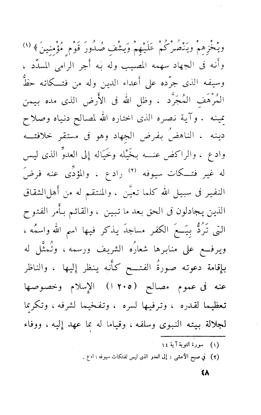 وَأَنه فِي الْجِهَاد سَهْمه الْمُصِيب وَله بِهِ أجر الرَّامِي المسدد وسيفه الَّذِي جرده على أَعدَاء الدّين وَله من فتاكته حَظّ المرهف الْمُجَرّد وظل الله فِي الأَرْض الَّذِي مده بيمن يَمِينه وَآيَة لنصره الَّذِي اخْتَارَهُ الله لمصَالح دُنْيَاهُ وَصَلَاح دينه الناهض بِفَرْض الْجِهَاد وَهُوَ فِي مُسْتَقر خِلَافَته وادع والراكض عَنهُ بخيله وخياله إِلَى الْعَدو الَّذِي لَيْسَ لَهُ غير فتكات سيوفه رادع والمؤدي عَنهُ فرض النفير فِي سَبِيل الله كلما تعين والمنتقم لَهُ من أهل الشقاق الَّذين يجادلون فِي الْحق بعد مَا تبين والقائم بِأَمْر الْفتُوح الَّتِي ترد بيع الْكفْر مَسَاجِد يذكر فِيهَا اسْم الله واسْمه وَيرْفَع على منابرها شعاره الشريف ورسمه وتمثل لَهُ بِإِقَامَة دَعوته صُورَة الْفَتْح كَأَنَّهُ ينظر إِلَيْهَا والناظر عَنهُ فِي عُمُوم مصَالح 205 أالإسلام وخصوصها تَعْظِيمًا لقدره وترفيها لسره وتفخيما لشرفه وتكريما لجلالة بَيته النَّبَوِيّ وسلفه وقياما لَهُ بِمَا عهد إِلَيْهِ ووفاء
